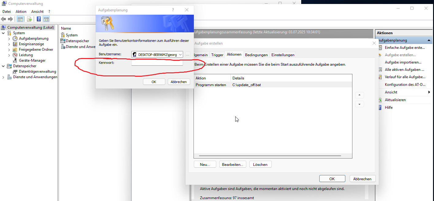 Bin mir nicht sicher, aber könnte sein dass du gar kein Kennwort gesetzt hast und die Aufgabenplanung nicht ohne PW will...