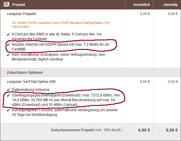 • mit Flat 9,90€/Monat. Dafür gibt es dann 500MB Highspeed und danach wird gedrosselt.