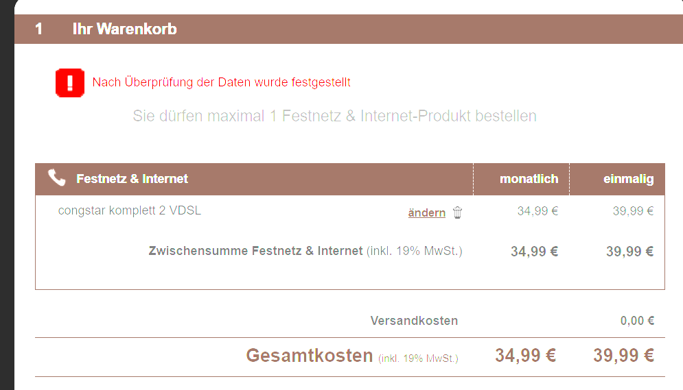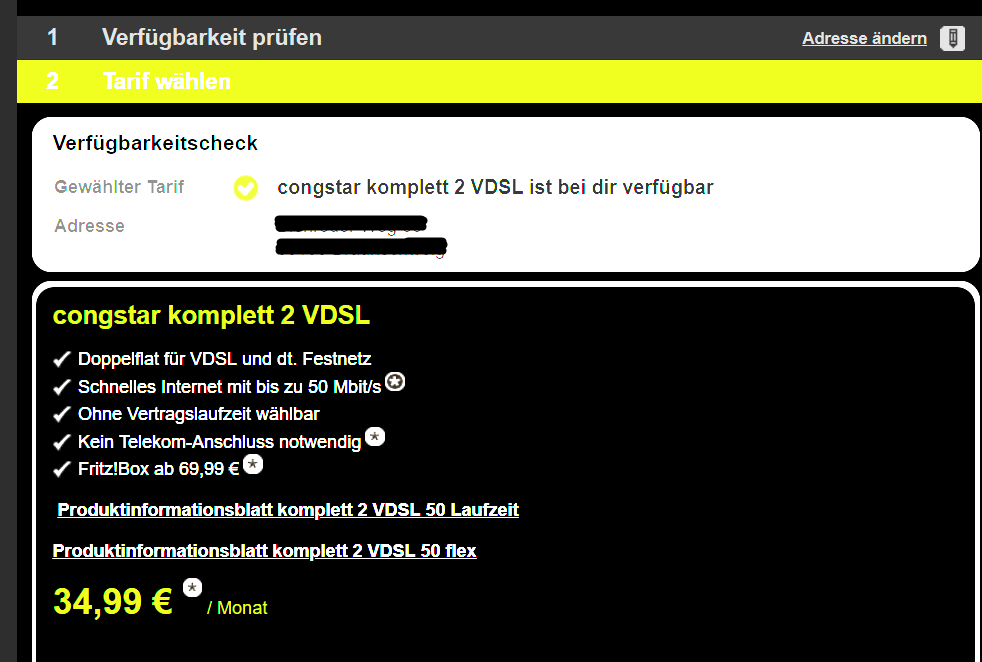 Habe den Verfügbarkeitscheck geprüft und der gewählte Tarif war verfügbar also habe ich das bei der Bestellung ausgewählt. Trotzdem war ein Tarifwechsel nicht Möglich und ich habe keine Ahnung wo das Problem ist. Jedenfalls habe ich jetzt bei Vodafone einen Tarif ausgesucht mit 50.000er Leitung und warte jetzt auf den Anschluss Termin. Trotzdem frage ich mich wieso es bei Congstar nicht funktioniert hat. Muss man erst kündigen um den Tarif zu wechseln oder ist bei mir eine 50.000er Leitung nicht Möglich?