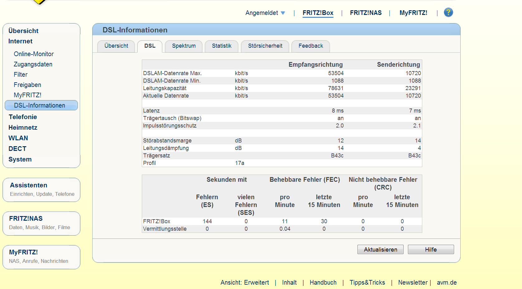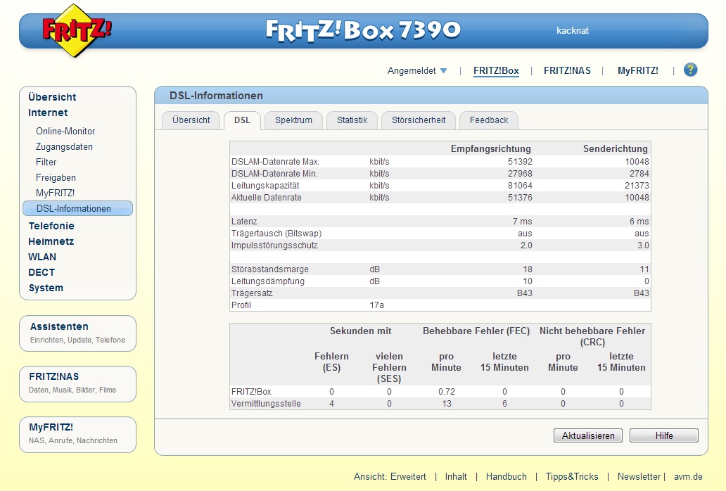 Seither habe ich mein System neu aufgesetzt, verschiedene PCs und Laptops am DSL Anschluss angeschlossen, weil ich dachte das es an meinem PC liegt, doch nichts hat sich an der Uploadgeschwindigkeit geändert. In der Fritzbox habe ich schon alle Einstellungen mal getestet. Auch unter DSL Information ist alles in Ordnung.