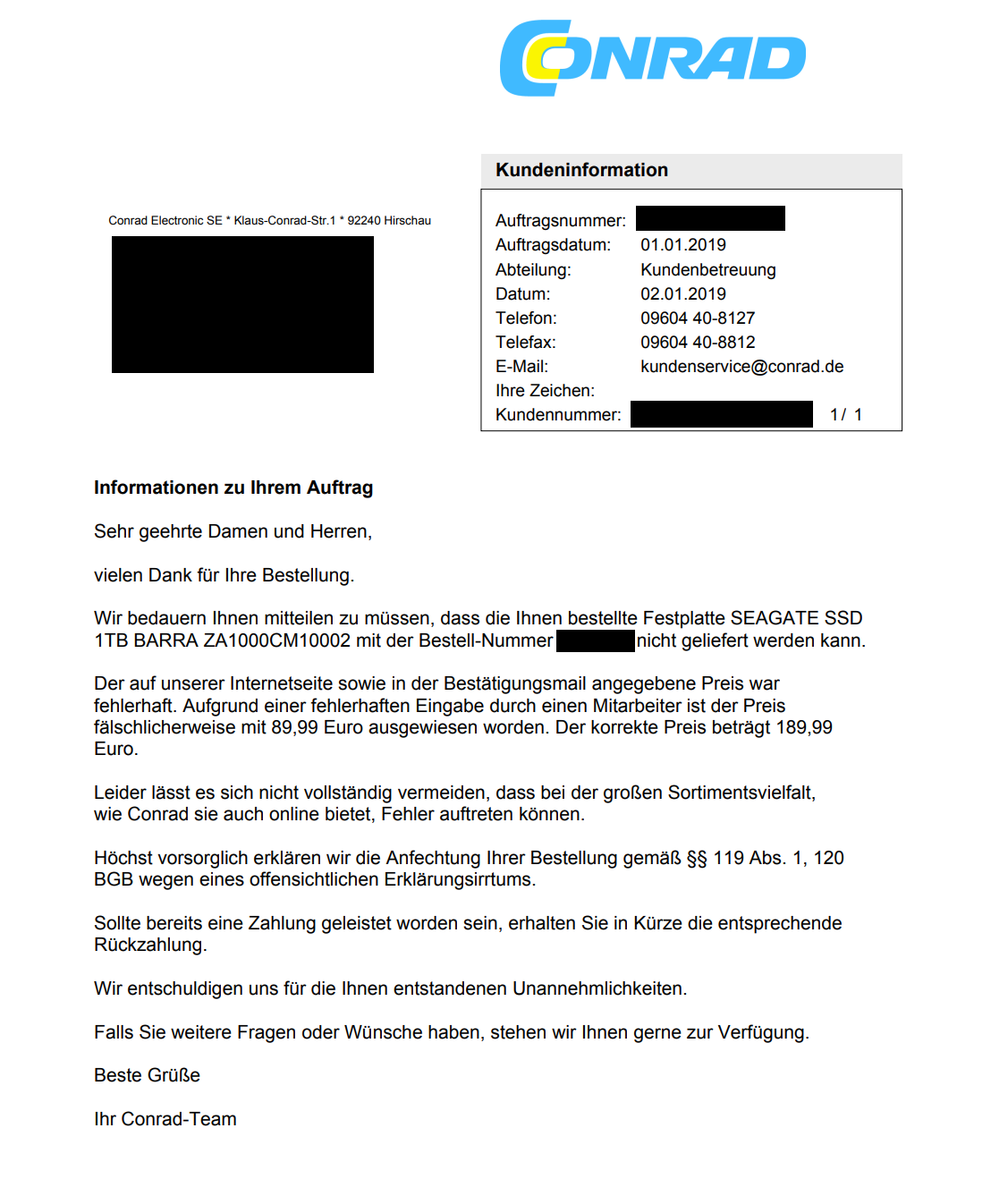 Anfechtung ist kein Allheilmittel. Der TE hat ja bereits Argumente geliefert, Conrad ist außerdem in der Erklärpflicht, wer, wie wann und wo welchen Fehler begangen hat.
