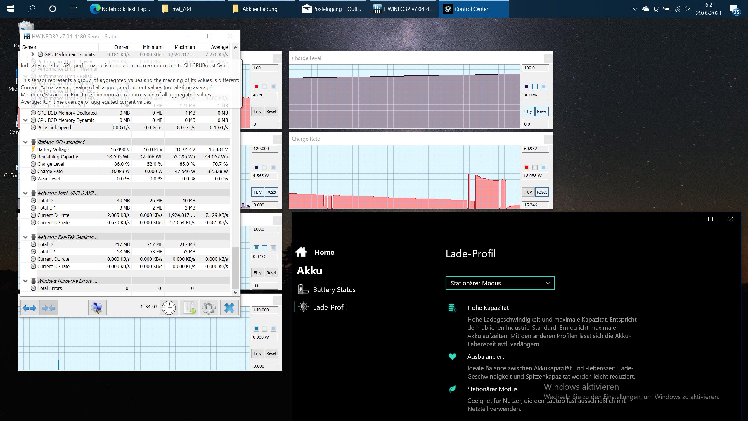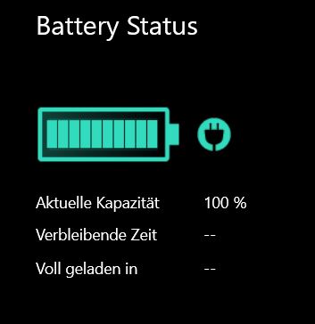 In jeglichem Lade-Profil wird das Gerät auf Max. Kapazität von 100% geladen. Wird das Notebook im "Stationären Modus" zwischen 85-100% entladen an das Netzteil angeschlossen beginnt zuerst das Akkusymbol von Windows mit einem Ladevorgang, meldet aber keine Ladung in der Textmeldung. Daraufhin friert das Akkusymbol ein, so das man meinen könnte der Akku wird auch nicht geladen.