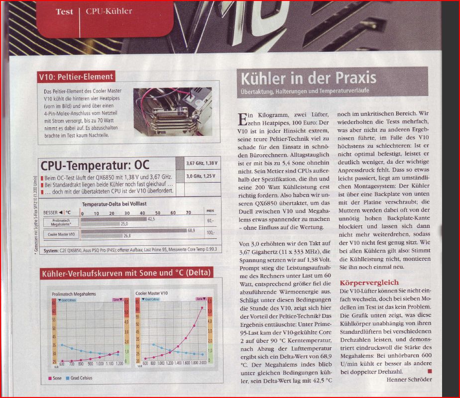 auf hundert % (2100rpm) bei 150 watt und abgeschaltetem pelztier hat der V10 ein delta von 19,3K, mit peltier sind es 17,8K. unbestreitbar prächtige werte