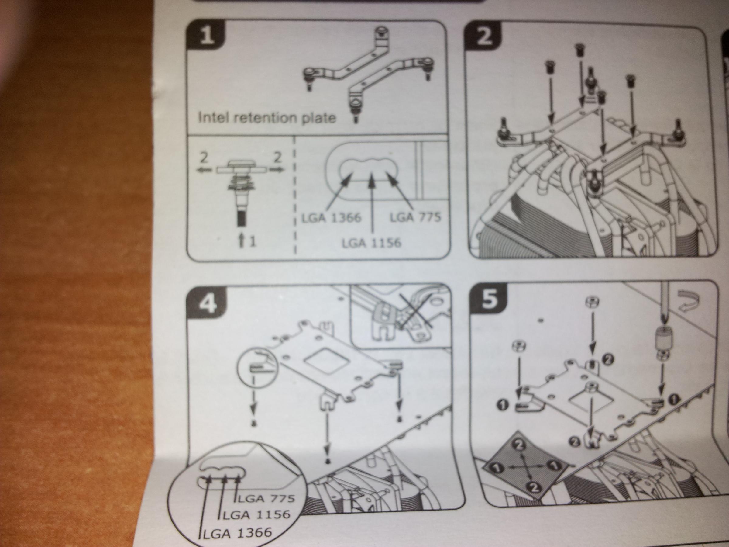 Du musst erst die Halterung für Intelboards (die mit den verstellbaren Schrauben) am Kühler befestigen,die mittlere Einstellung ist für 1155er Boards. Dann die Distanzringe auf die Board Oberseite kleben. Nun legst du den Kühler am besten auf nen Tisch mit der Unterseite nach oben,dann kannst du das Board auflegen und gucken das er richtig aufliegt.