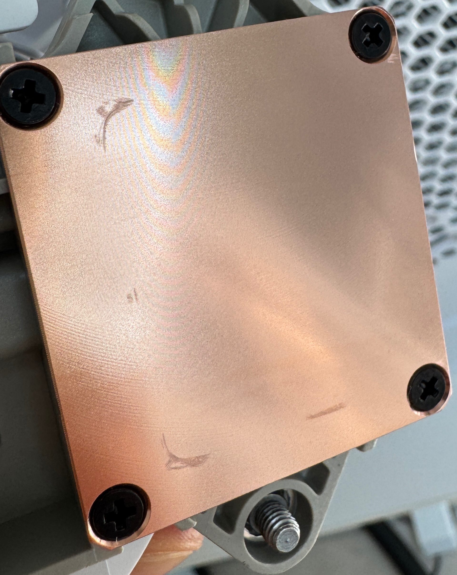 ich habe meine neue AIO angebracht und musste feststellen, dass ich anscheinend zu viel Wärmeleitpaste benutzt habe, da etwas an den Seiten rausgequillt ist. Hab dementsprechend nochmal abmontiert und wollte es säubern und neu machen. Da ist mir aufgefallen, das auf der Kupferplatte die Umrandung der CPU sichtbar ist. Kupfer ist zwar ein weicheres Metall aber das sollte das nicht passieren oder ? Kann man den so noch benutzen ?