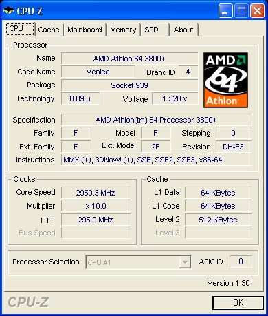 2950 Mhz. (10 x 295 HTT) @ 1,52 V (Bios 1,55 V) @ ca. 36 °C LAST