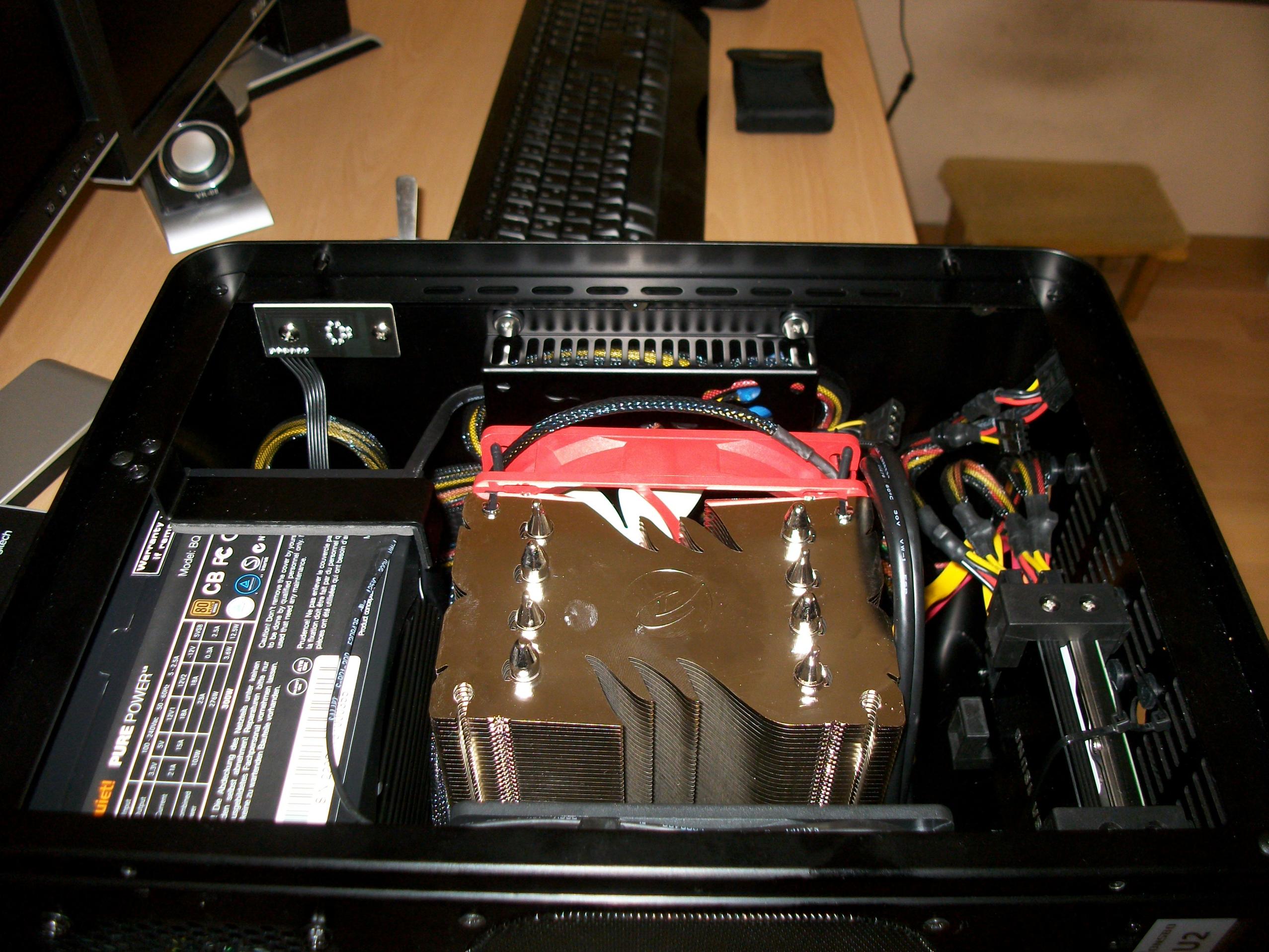 passt alles rein? ja, und es ist auch noch platz für eine gpu, sollte ich tatsächlich mal spielen wollen. sehr nützlich fand ich den käfig an der front. wenn man wie ich zu geizig ist, ein netzteil mit kabelmanagment zu kaufen, kann man nutzlose stränge dahinter bestens verstauen.