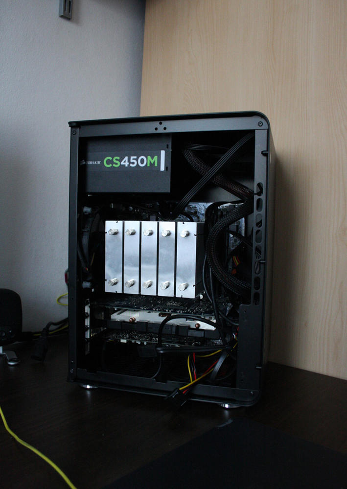 Früher war sie in einem NZXT Gehäuse, so sie von einem seitlichen Lüfter versorgt wurde (etwa 600Rpm). Man muss dazu sagen das das Gehäuse am Boden stand - das U3 steht jetzt auf einer Ikea Tischplatte (Holzimitat, Innen Hohl).
