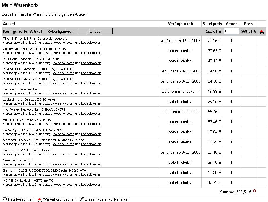 EDIT: so. Ich habe mir mal die Freiheit genommen das non plus ultra zu nehmen. Man kann da aber noch ein bisschen sparen (TVkarte weglassen, Boxen weglassen, Keyboard und Maus weg, nur 2 GB, Die laufwerke, Das gehäuse). Aber ich dache wenn dann komplett, wegstreichen kann man immer noch.