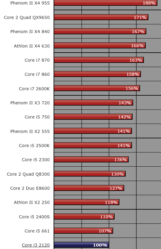 Ich hab mir die Test angeguckt vom Core i3 2100 und mit dem Phenom 955 verglichen.