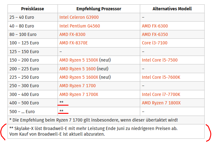 Die Empfehlungstabelle ist mal schön zu lesen.