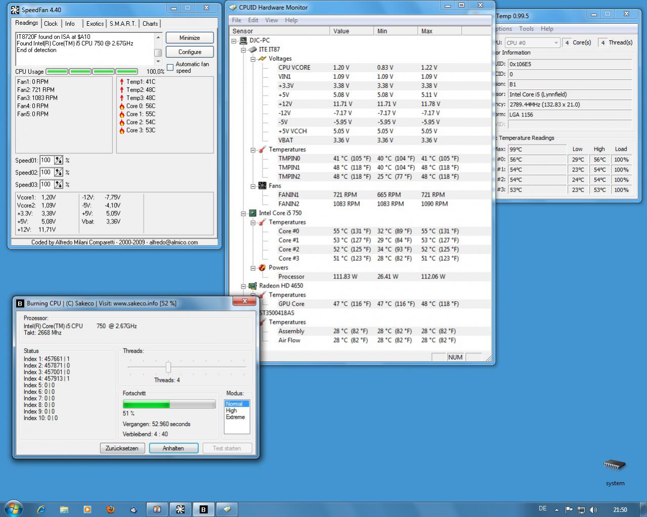 Aktuelle Prozessoren wie Core i5/i7 verfügen über Digitale Thermal Sensoren (DTS) in den einzelnen Kernen, die die Abstandswerte zum Thermal Control Circuit (TCC) ausgeben, also die Abstandswerte zu dem Punkt, an dem die CPU zu heiß wird, auch als TjMax bezeichnet. (Weiter oben in diesem Thread ja schon erwähnt.) Dieser TjMax Wert wird für jedem Prozessor individuell bei der Fertigung festgelegt und ist nicht veränderbar. Ein einzelner Abstandswert entspricht dabei etwa 1°Celsius, laut INTEL mit einer Genauigkeit von +/- 0.1°C.
