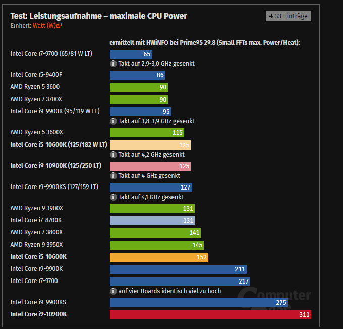 Und nimmst du deiner CPU 100-200MHz weg, sind es direkt 100W weniger bei 2% weniger Performance. Eine auf Kante übertaktete Intel CPU ist absolut nicht repräsentativ.