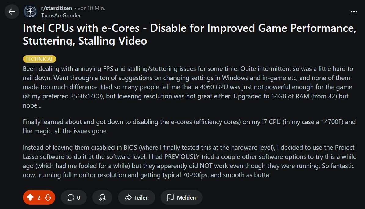 Das Spiel kommt halt mit E-Cores nicht klar. (Siehe Anhang)