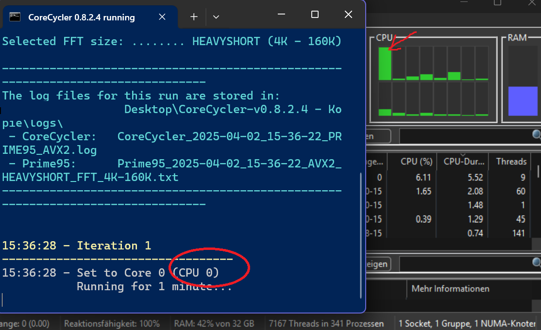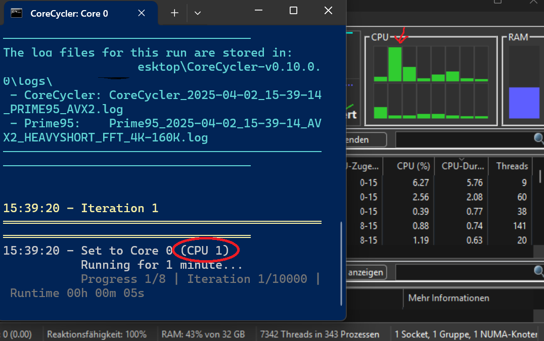 Daher hoffe ich, die zwei schnellen Screenshots belegen mein Problem nachvollziehbar. Wenn ihr eine Idee habt, was ich falsch eingestellt haben könnte, gern her damit. Die Configs habe ich jedenfalls nahezu auf Standard gelassen und Änderungen auf SSE oder AVX2 ändern nichts an dem Problem (hab es jetzt zum Test nur auf 1 Minute gestellt). Weil es kompakter ist, habe ich beim Screenshot Process Lasso statt dem Task-Manager eingeblendet und man kann gut erkennen, dass bei der neueren Version der logische HT-Kern statt dem physischen Kern unter Last gesetzt wird. Testreihenfolge bei beiden configs 0, 1, 2, 3, 4, 5, 6, 7.