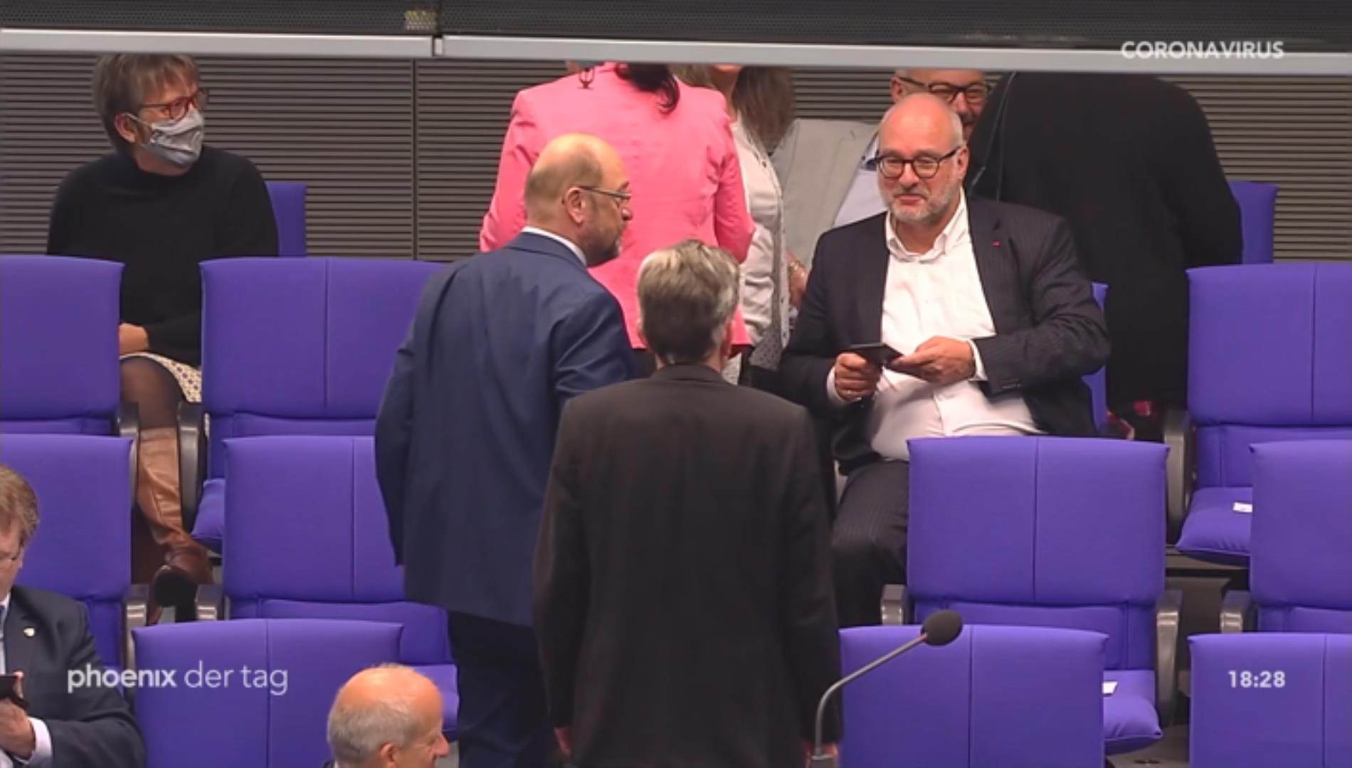 Kaum einer hat einen Mundschutz, weil es wohl eine nationale Maskenknappheit gibt. Trennscheiben gibt es wohl auch nicht, weil es wohl die parlamentarische Würde des Reichstages verletzt.
