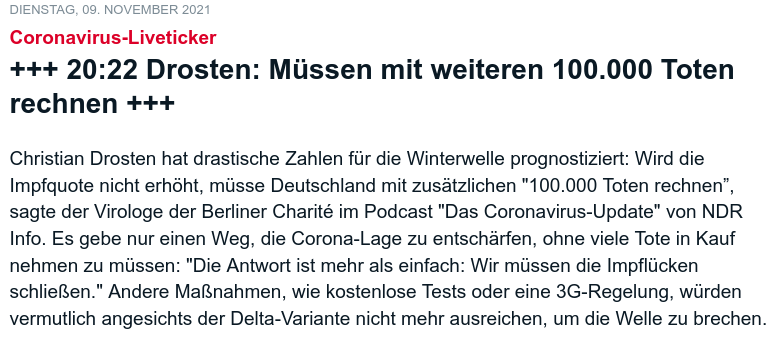 ich mach das so lange, solange man sich hinstellt und "Geimpfte" als Unbeteiligte herauszustellen sucht und nur den Ungeimpften die Schuld in die Schuhe schieben will.