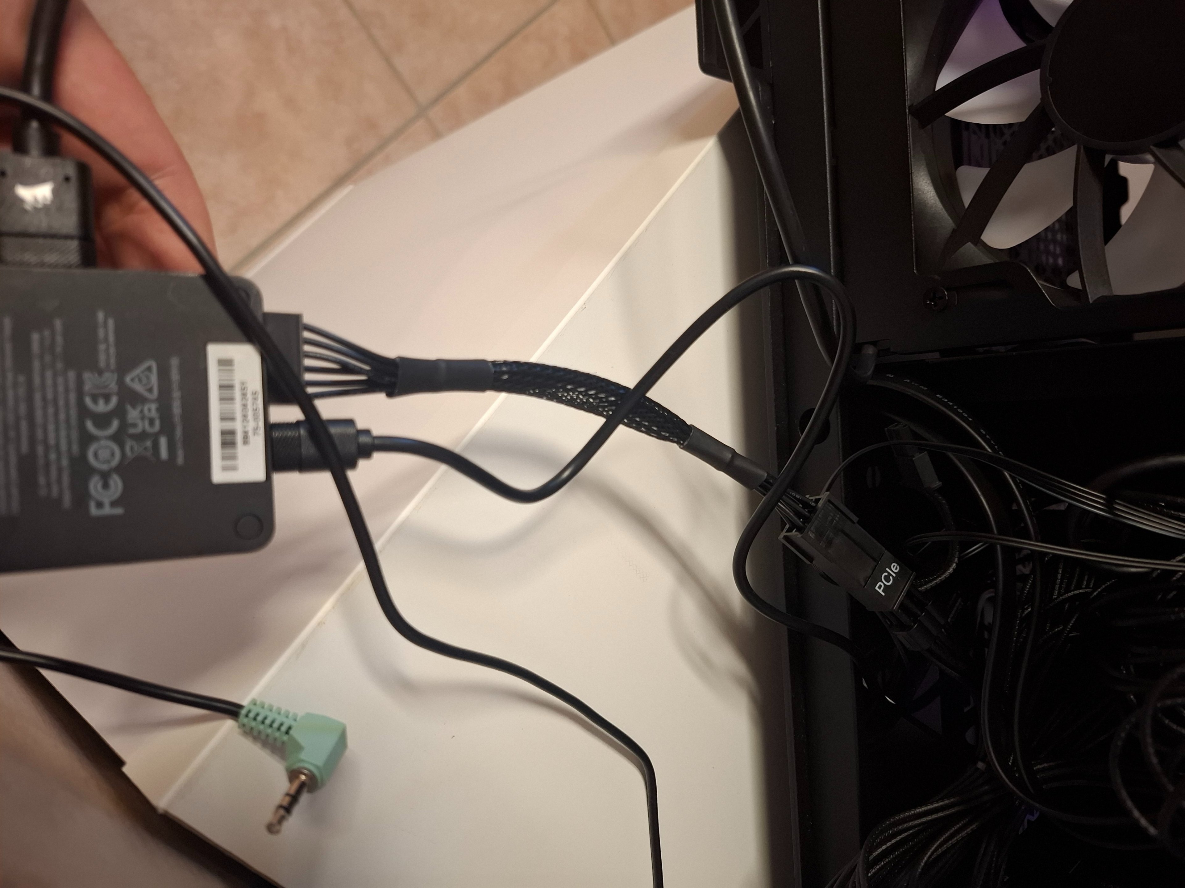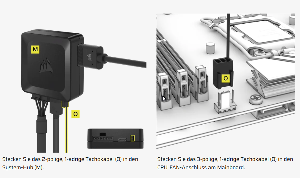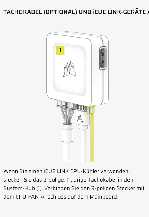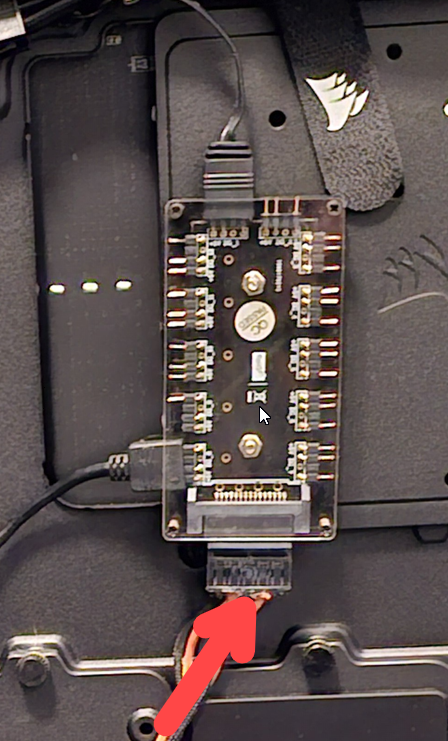 ich habe an das mitgelieferte kleine Hub einen PCIe stecker angeschlossen der in das Netzteil geht. Desweiteren geht ein Kabel vom Corsair-Hub an das Mainboard (USB-Steckplatz). Das dritte und letzte Kabel geht von den Lüftern direkt an eine der zwei seitlichen Steckplätze an das Hub.