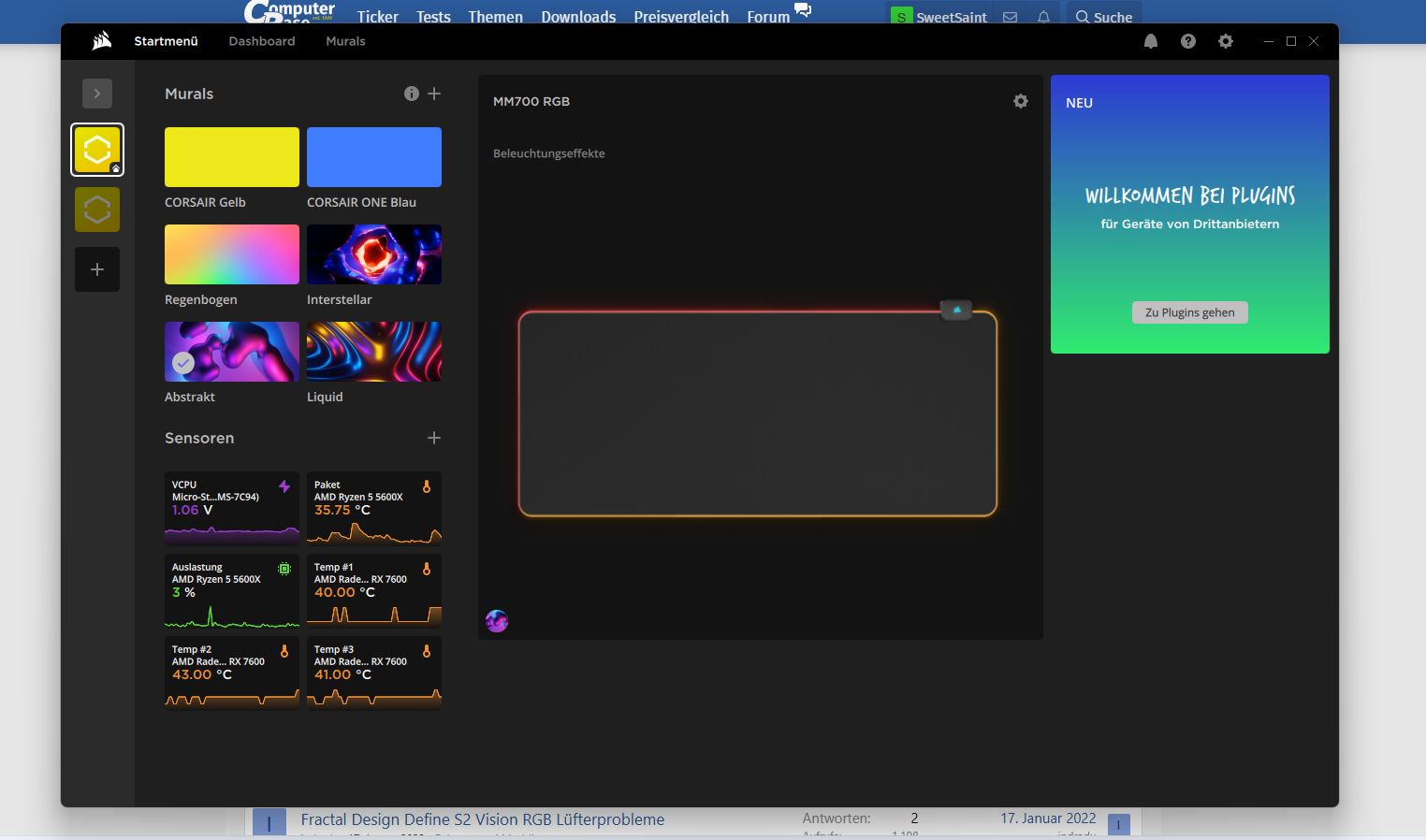 Der Rest des PCs läuft von Beginn an einwandfrei, doch die beiden Lüfter haben noch nicht einmal gedreht bzw geleuchtet. Auch die Software von Corsair erkennt keine Lüfter (zumindest kann ich keine steuern oder anwählen).