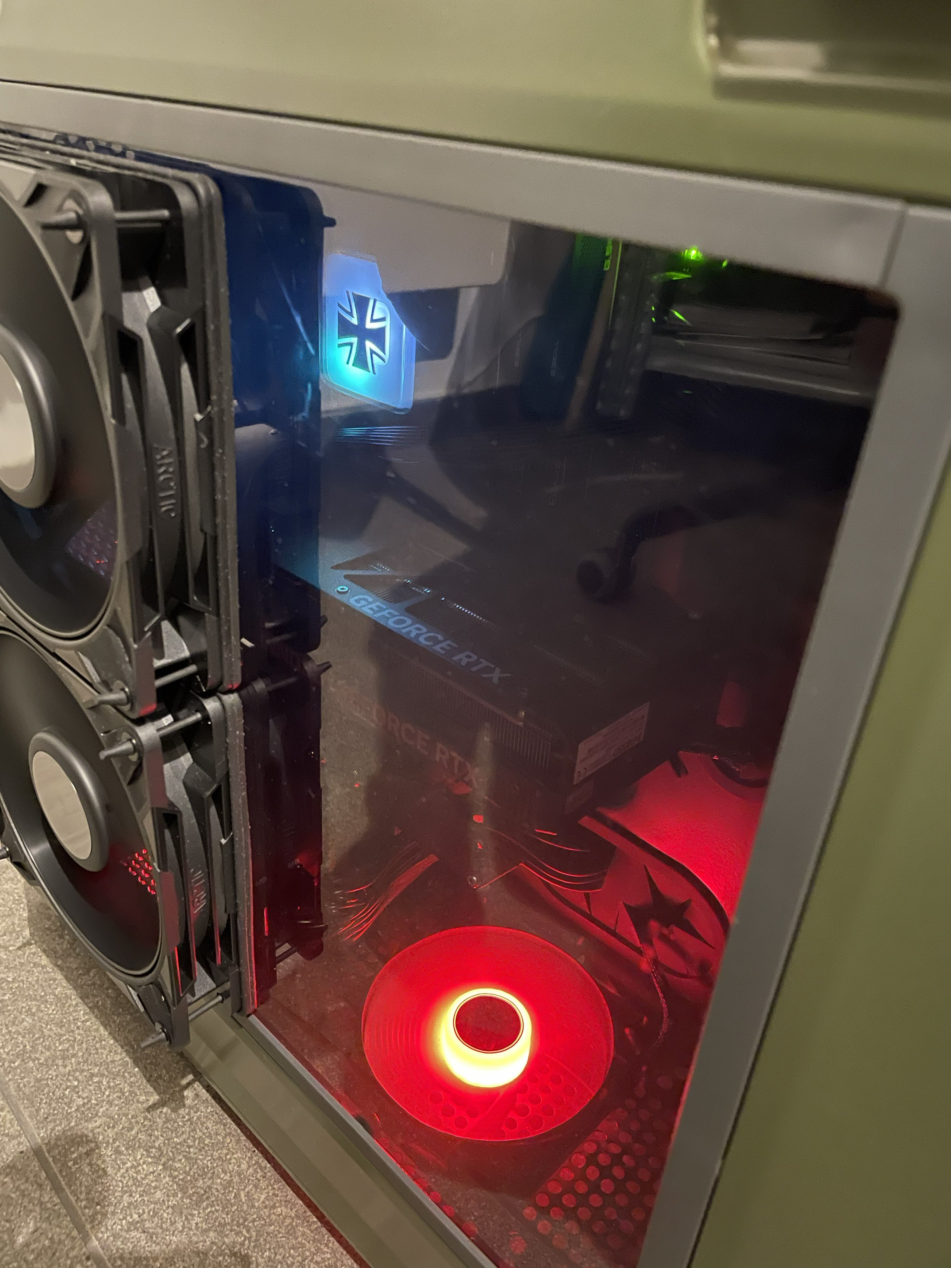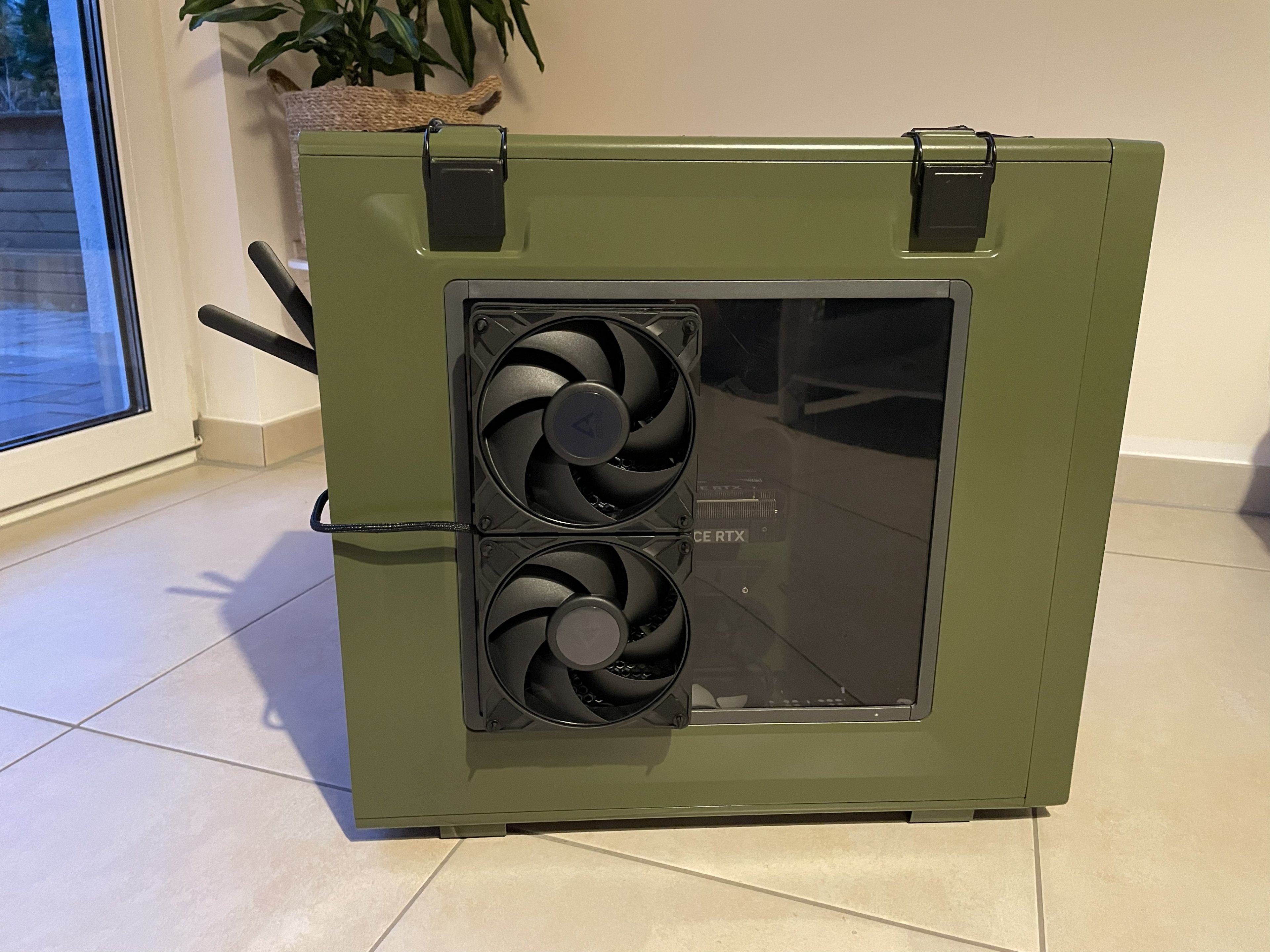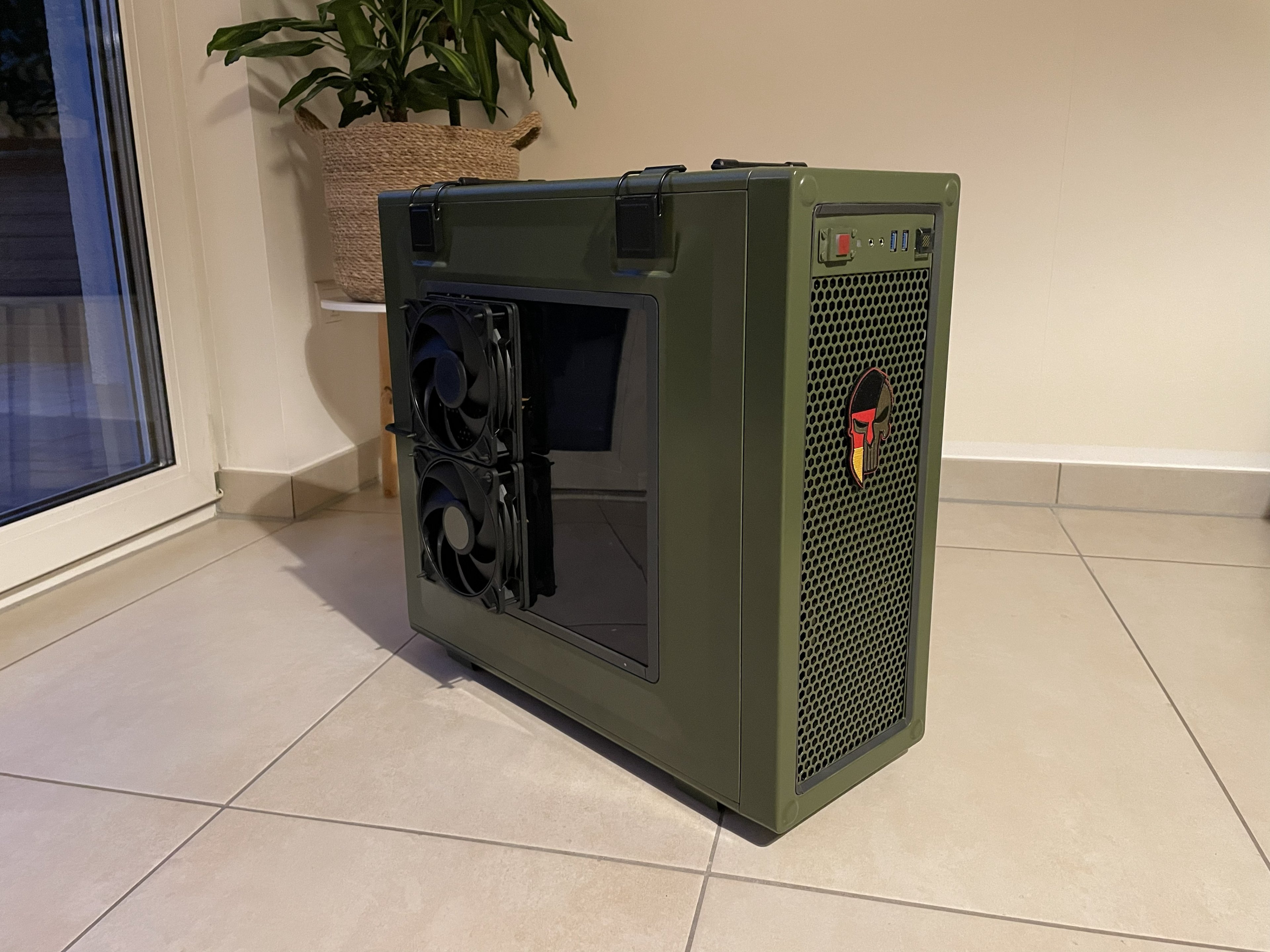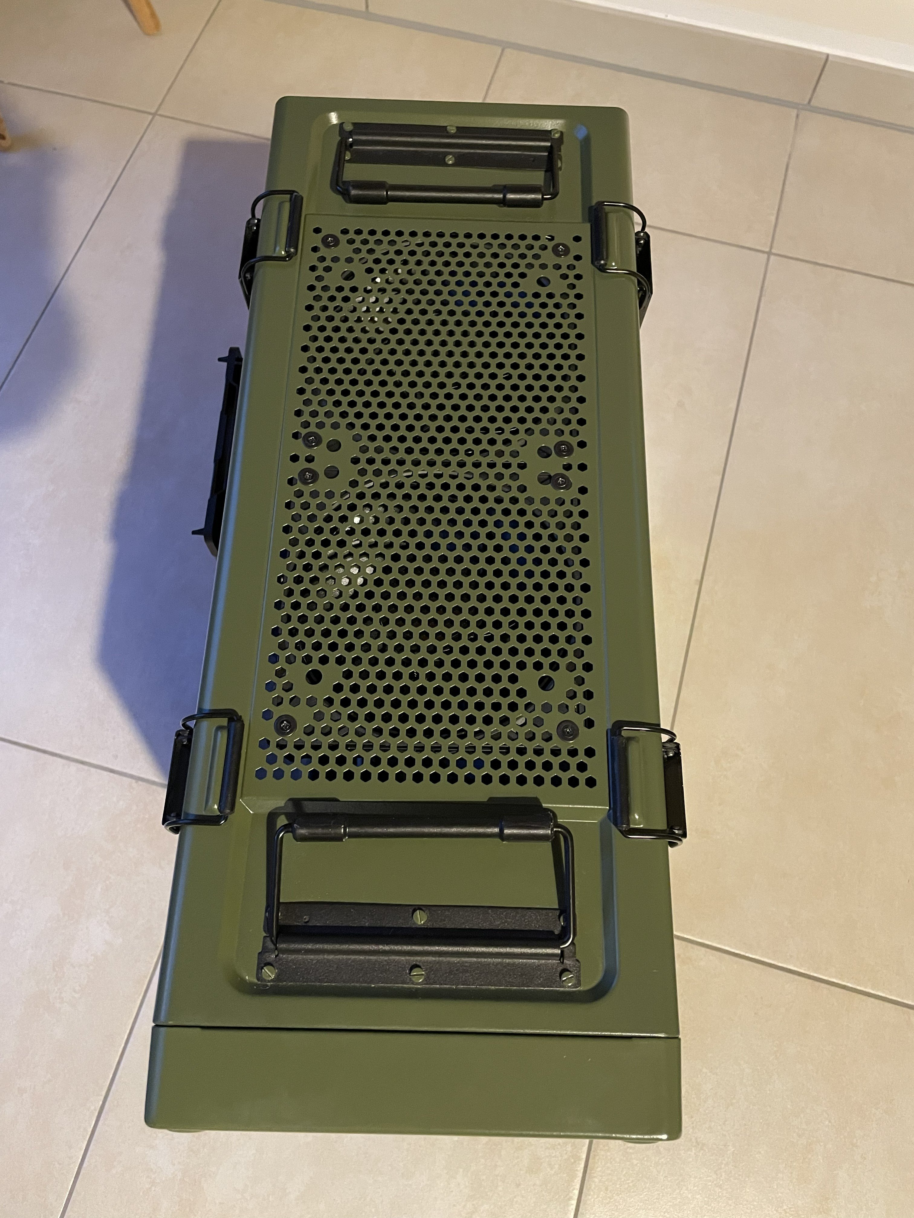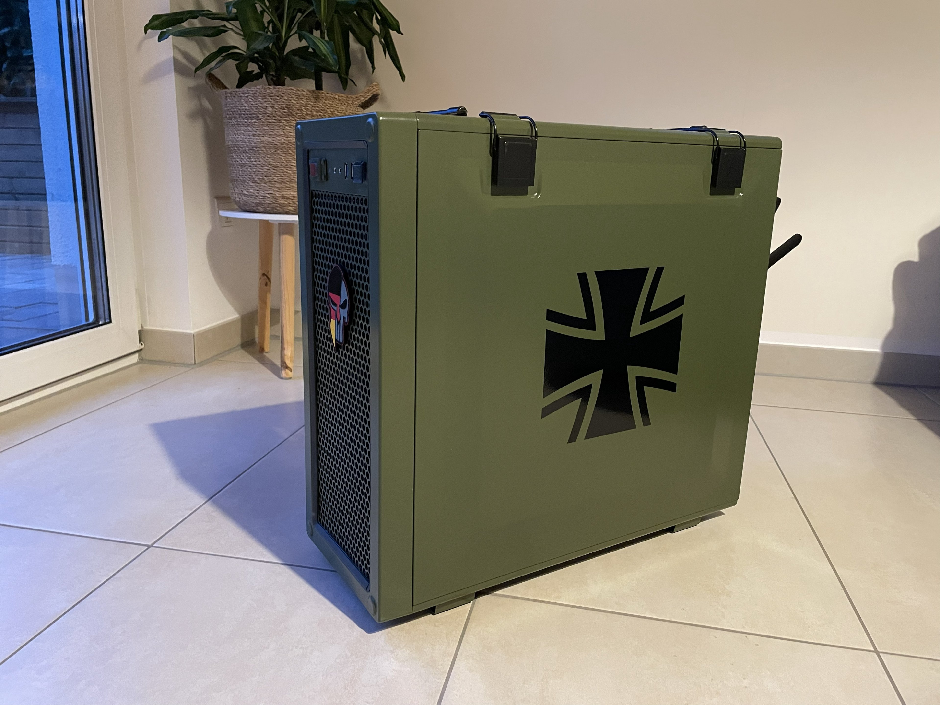 Durch glückliche Umstände bin ich an ein Corsair C70 Vengeance in der Farbe Schwarz gekommen. Ich hatte das Gehäuse zuvor noch nie gesehen, weil ich um 2012 rum mit Beruf, Familie etc. beschäftigt war, aber dieses Design hat mich direkt angesprochen. Nach einiger Recherche habe ich dann gesehen, dass es das Gehäuse auch in Olivgrün gab, was ich noch stimmiger fand. Leider wusste ich einige Zeit nicht, wie ich das Gehäuse für mein System nutzen könnte. Die 5.25 Schächte ließen sich nicht wirklich sinnvoll benutzen... also habe ich mich für den Umbau und eine AiO Wakü entschieden.