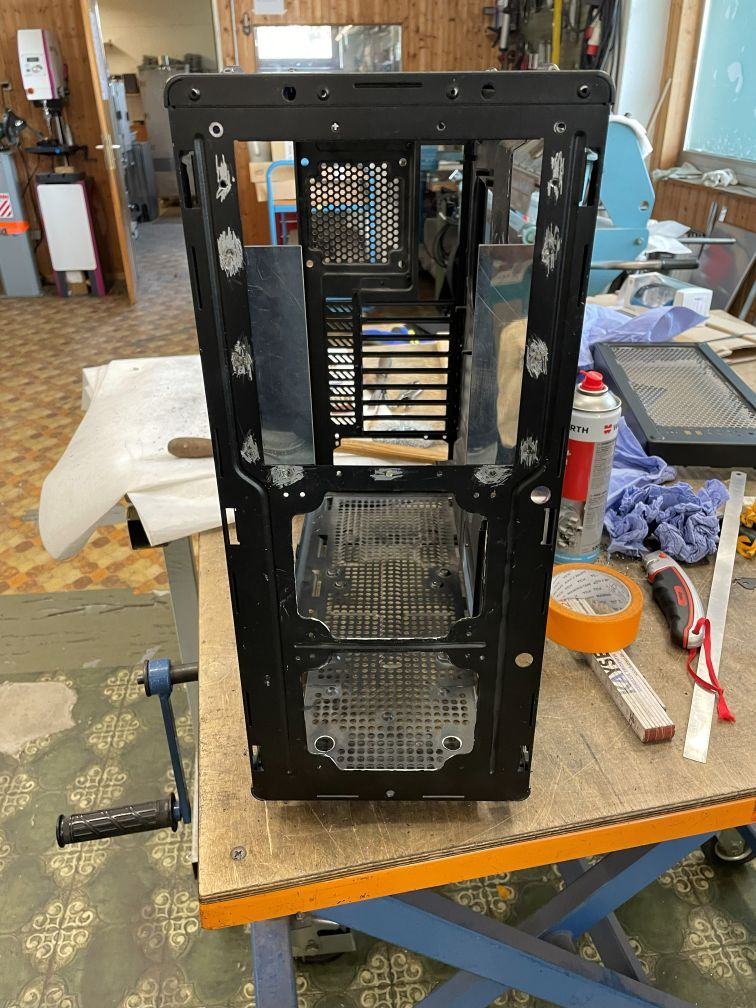 Begonnen hat alles damit, dass ich unter tatkräftiger Hilfe meines 13-jährigen Sohnes die Nieten der Schächte und Griffe entfernt habe. Anschließend wurde das Gitter unterhalb der Schächte entfernt und für das Kaltschweißen vorbereitet, um das größere Ersatzgitter von Amazon mit Hexagonalmuster anzubringen. Neben diversen Begradigungen wurden zwei Edelstahlleisten zur Montage des Radiators eingeschweißt. Da ich die WaKü zu diesem Zeitpunkt noch nicht hatte, geschah dies nur auf Augenmaß.