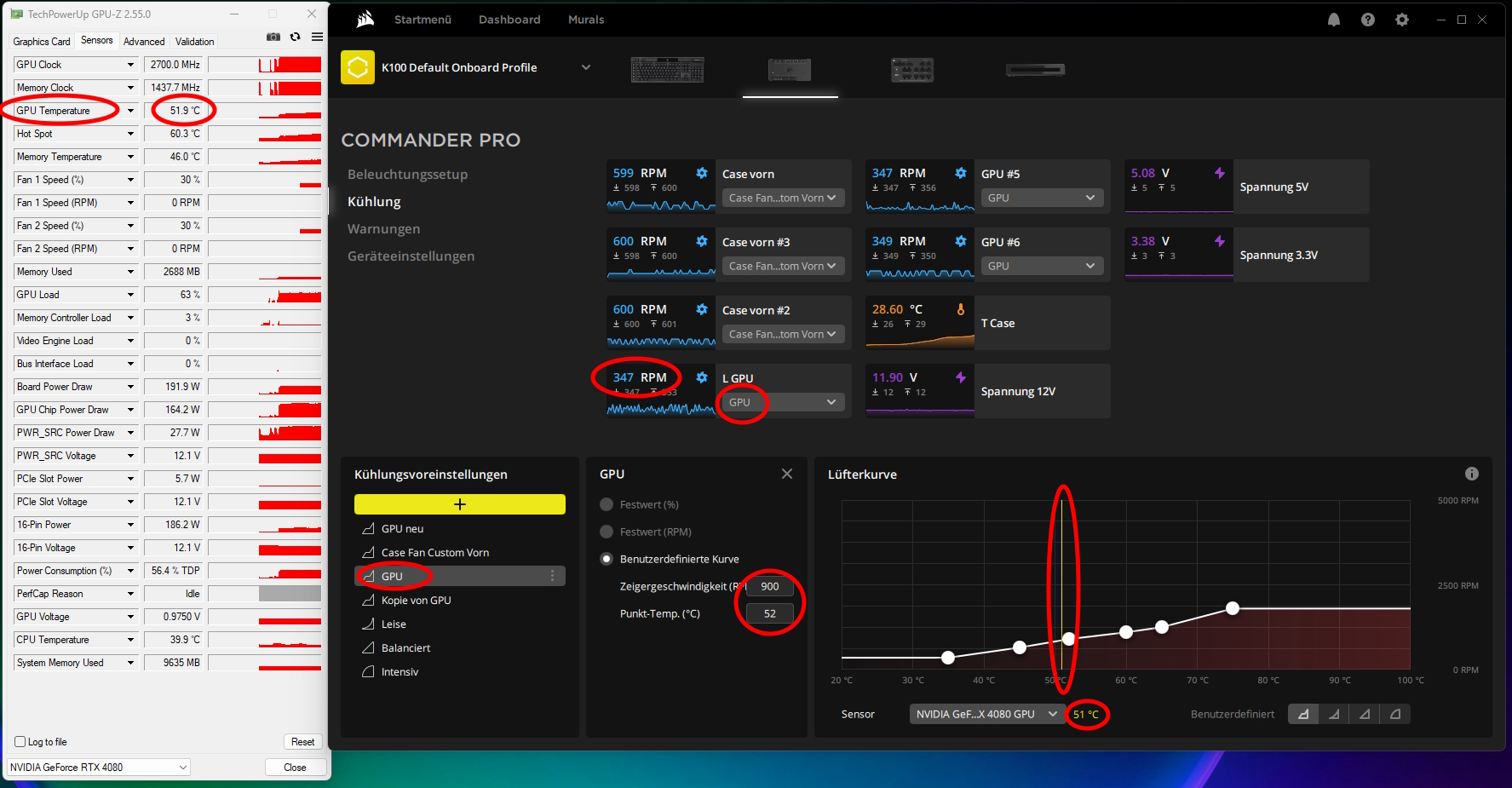 ich habe seit neustem ein Problem mit der Lüfterkurve meines Commander pro. Ich habe 3 Lüfter angeschlossen, die ich über die GPU-Temperatur steuere. Das funktionierte monatelang wunderbar. Gestern ist mein System dann mehrfach abgeschmiert und überhitzt, ich hoffe es hat keinen Schaden genommen ! Nach einer kurzen Ursachensuche stellte ich fest, dass die Lüfter nur noch mit der Minimaldrehzahl laufen, unabhängig von der Sensortemperatur. Die Temperatur wird korrekt ausgelesen, ein Wechsel des Sensors von GPU auf CPU brachte keine Besserung, die Lüfter bewegen sich nicht. Ich habe eine 2. Lüfterkurve, die ich anhand der Temperatur eines an den Commander angeschlossenen Sensors nutze, diese funktioniert wie sie soll. Offensichtlich werden seit dem letzten Update Temperaturen von GPU / CPU ect. zwar korrekt ausgelesen und angezeigt, jedoch nicht an die Lüfterkurve übergeben ?!?