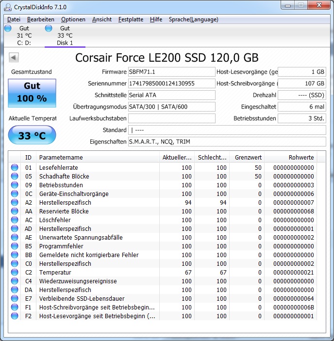 Ich habe mir eine SSD (Corsair Force Series LE200 120GB 2,5" ) für meinen Zweitrechner gekauft.