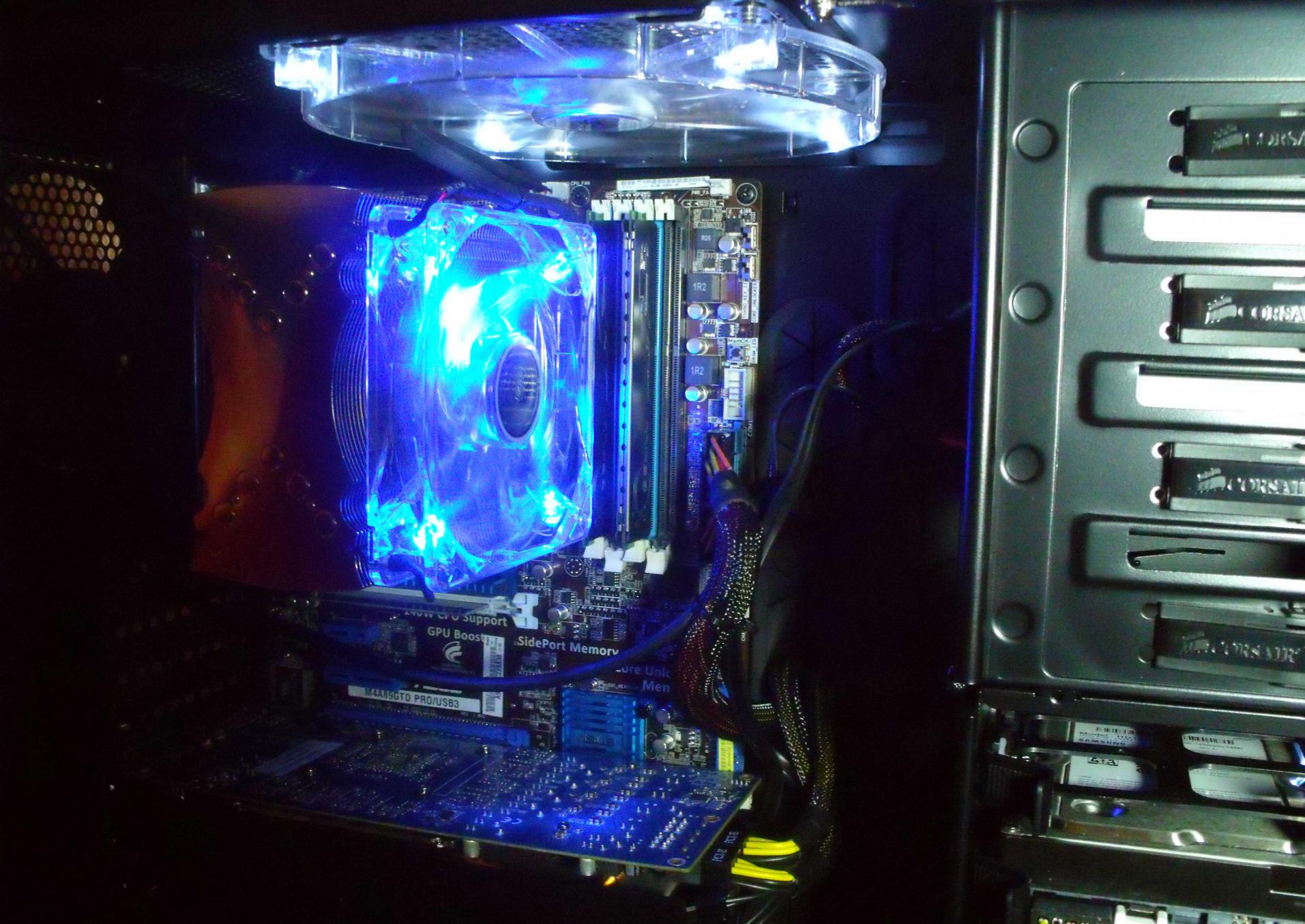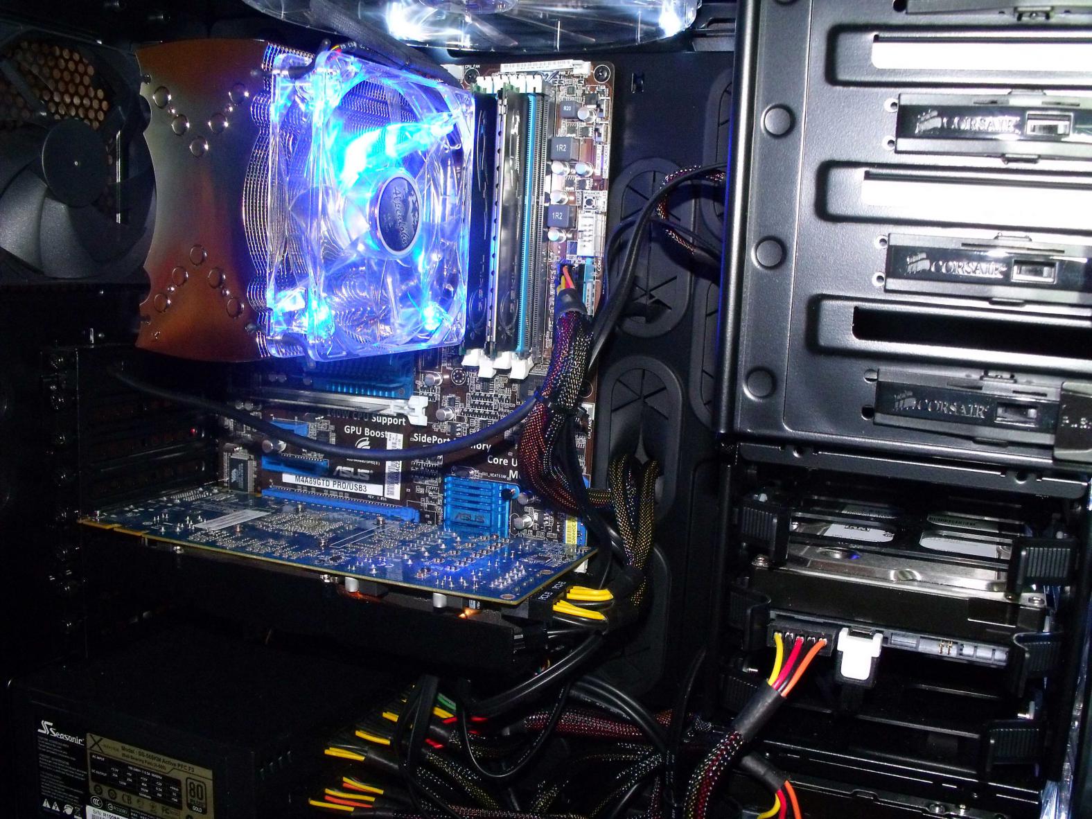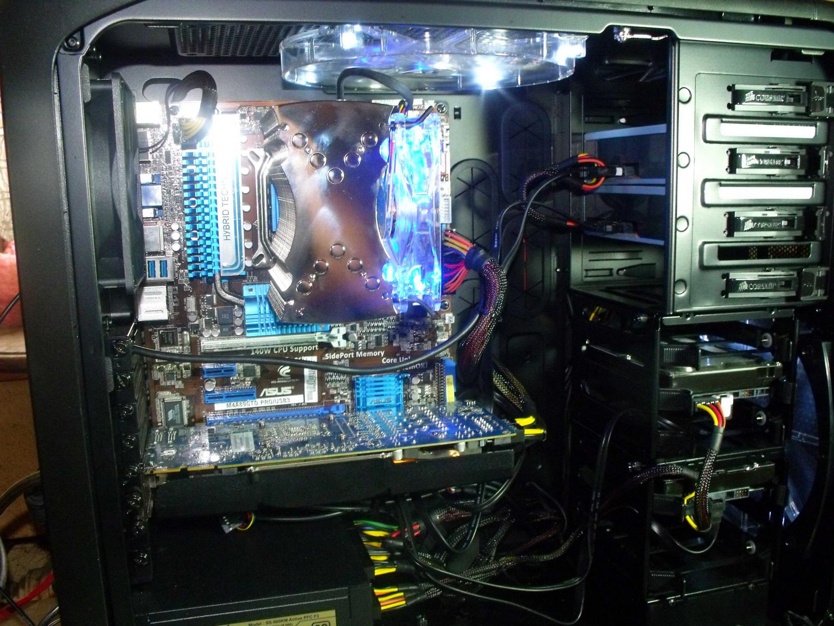 Ich werde mein Netzteil nicht umdrehen. Mit dem Strang so weit vorne werden dann die Kabel zu kurz. Es war schon so eine scheiß Friemelei, den CPU-Stromstecker dranzukriegen. Den Hecklüfter habe ich schon abgeschraubt gehabt. Bei solchen Sachen ist eine Corsair H70 dann gut. Den Scythe habe ich angebracht, wo die Platine noch draußen war. -.-