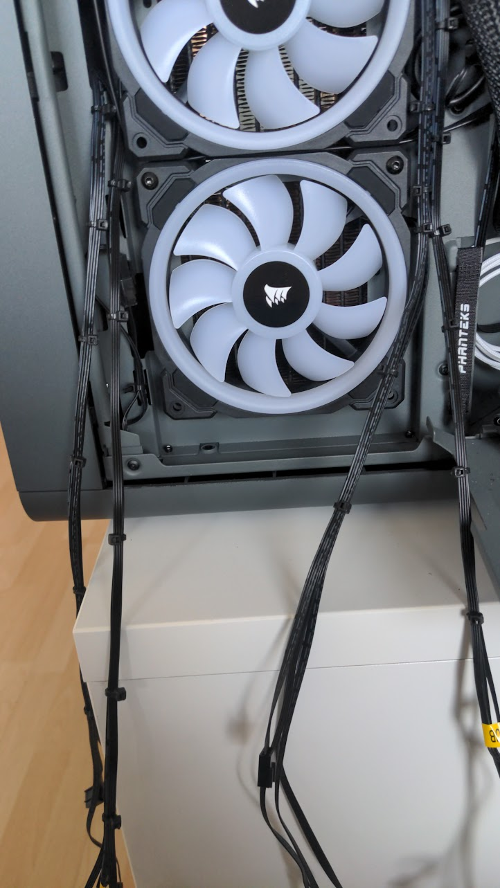 Mittlerweile hab ich auf Lian Li umgestellt. Da kannst du die Verkabelung lassen wie sie ist, einfach das eine Kabel vom Lüfter abmachen und die Lüfter als zusammensetztes 3er Pack abnehmen wenn du irgendwo mal ran musst. Die Lian Li waren schon teuer: 3 Stück für knapp unter 100€. Aber die Preise der neuen Corsairlüfter sind einfach nur unverschämt in meinen Augen.