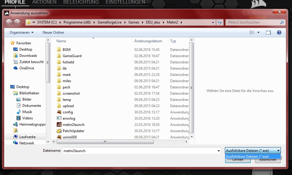 Ich habe mir jetzt auf Basis der Steuerung in einem Spiel in der CUE-Software nun meine Tastatur mit Beleuchtungsmodi bestückt. Dieses Profil möchte ich natürlich mit dem dafür passenden Spiel verknüpfen, damit dieses beim Start automatisch aktiviert wird. Und hier stoße ich schon an meine Grenzen. Denn mit der Programmzuordnung kann man nur EXE-Dateien auswählen. Die EXE-Datei des Spiels aber ist nur der Patcher/Updater des Spiels. Der Client und damit das Spiel selbst wird jedoch mit einer BIN-Datei aufgerufen. Und die können in der Programmzuordnung nicht gewählt werden, was nun dazu führt, dass bei Spielstart immer nur das Default-Profil verwendet wird. Wenn ich nun die EXE-Datei, also den Patcher damit verknüpfe, aktiviert er das entsprechende Beleuchtungsprofil, sobald der Patcher gestartet wird. Wenn aber dann das Spiel an sich, also die BIN-Datei, durch den Patcher aufgerufen wird, geht dieser in den Sys-Tray und das Profil springt wieder zurück zum Default.
