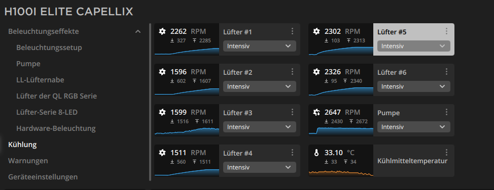 Wenn ich die Lüfter auf die Intensiv Voreinstellung fahre drehen Sie auch auf ~1500 RPM, aber auf Nulldrehzahl bleiben Sie auf ~560rpm