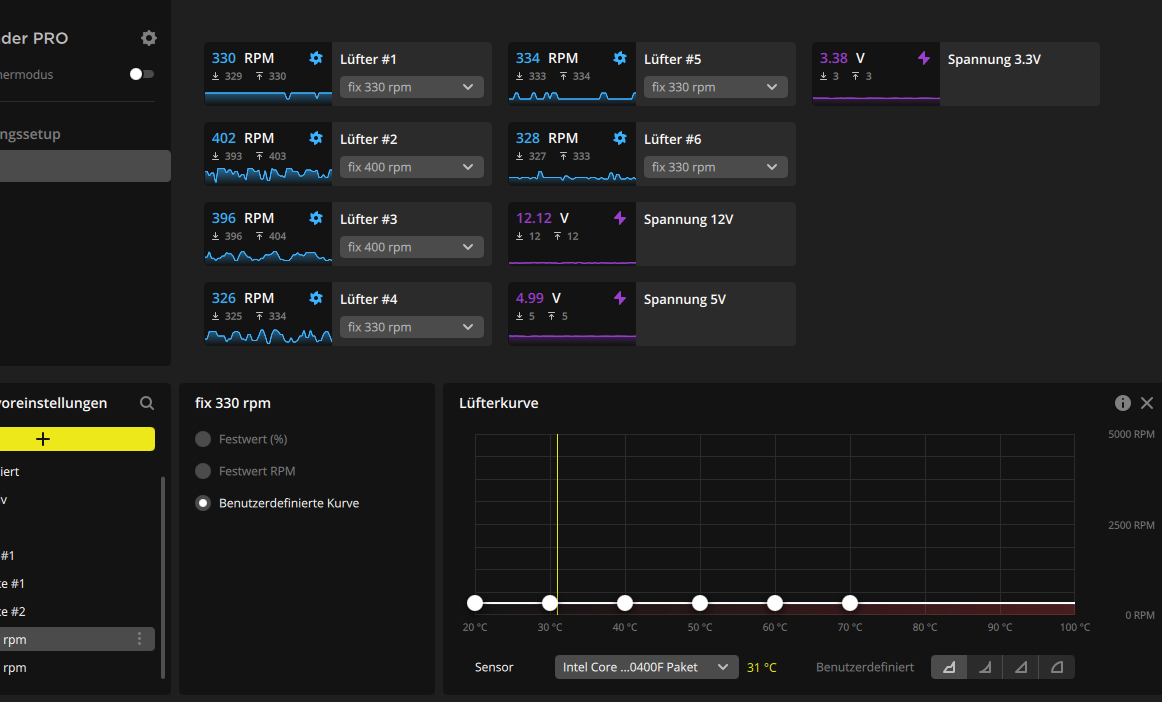 Die Lüfter laufen manchmal ganz normal und ruhig (zb beim start bis zum einloggen), aber dann drehen sie plötzlich wieder komplett hoch. Sie reagieren dabei überhaupt nicht auf die eingestellte Lüfterkurve oder die BIOS als auch die Icue einstellung denn dort hab ich auch bereits alles auf Stufe leise getan aber da ändert sich nichts.