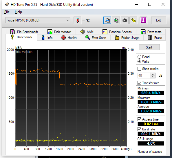 Habe mir jetzt einfach mal die 4 TB Corsair MP510 bestellt und ein paar Benchmarks durchlaufen lassen. SSD steckt im untersten M.2 Slot des X570 Unify. CPU ist ein 5950X. Was haltet Ihr von dem Ding? Performance ok? Man muss halt in den sauren Apfel beißen wenn man 4 TB auf einer NVMe braucht und kein QLC will. Die einzige Alternative mit 4 TB, die PNY XLR8 CS3040 4TB (mit PCIe 4.0) ist nirgendwo lieferbar.