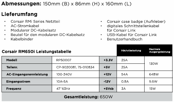 Als Straßenpreis wird für das Corsair RM650i aktuell um die 119 Euro aufgerufen, was für das Gebotene angemessen ist, besonders wenn man die sehr großzügigen sieben Jahre Garantie berücksichtigt. Benötigt man Corsair Link nicht, möchte aber trotzdem ein solch gutes Netzteil haben, kann man auch zu dem gerade vorgestellten RM650x greifen, was ca. 10-20 Euro günstiger ist und die Überwachungsmöglichkeit einspart.