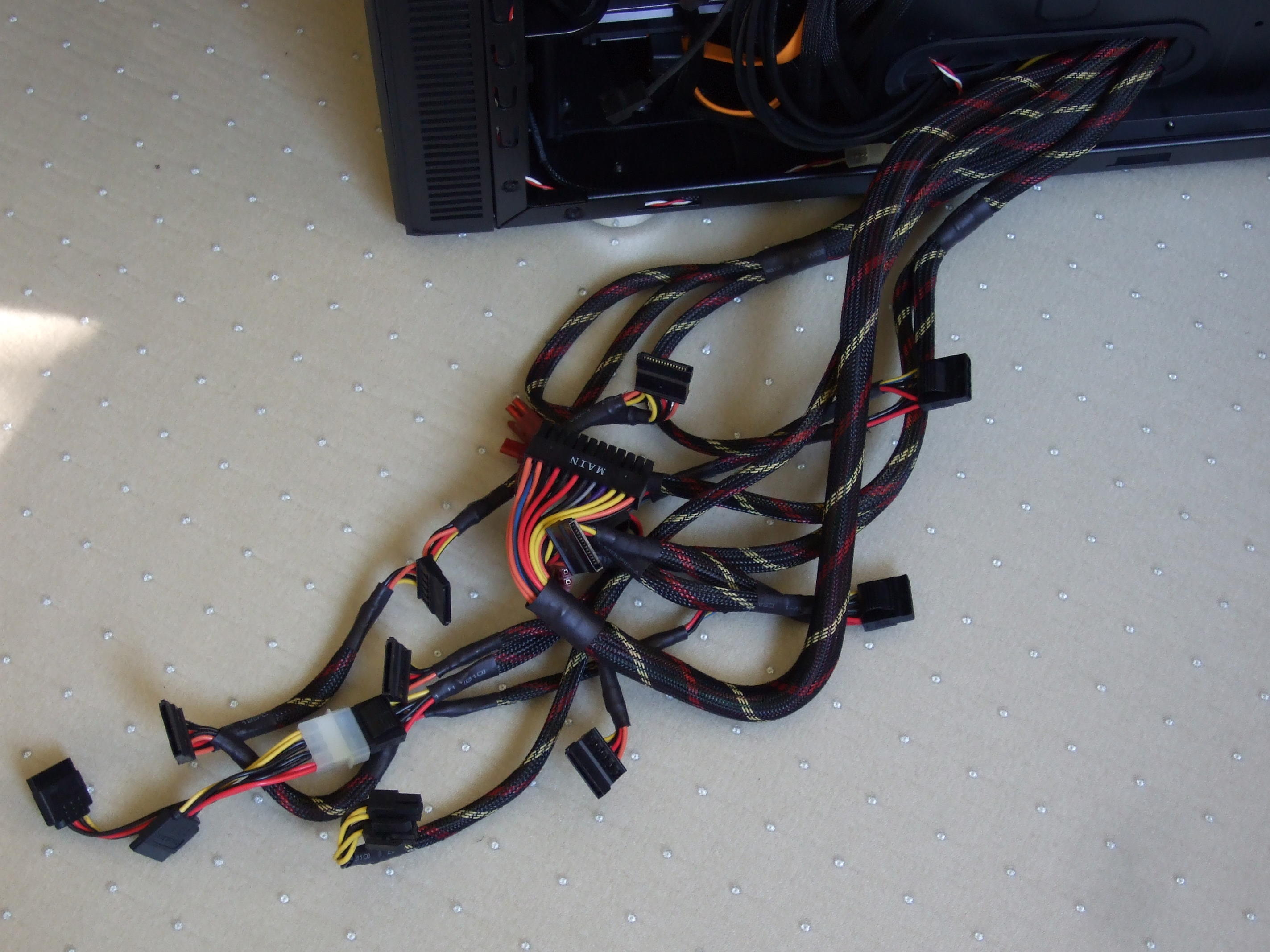Man sieht schon rein praktisch, dass es zwar von vorne halbwegs aufgeräumt aussieht, aber ich hatte auf der Rückseite etwas Mühe, die Kabel des Enermax-Netzteils so anzuordnen, dass auch die Seitentür noch zugeht. Dabei bietet das Fractal Design Define R4 hier ja schon reichlich Platz. In vielen Gehäusen geht es weitaus beengter zu, bzw. man muss die Kabel vorne kreuz und quer verlegen, weil hinten gar kein Platz ist. Dies ist der Kabelbaum, der aus dem Enermax kommt:
