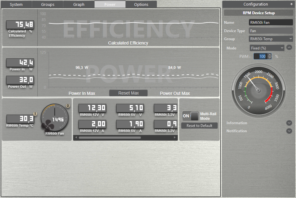 Insgesamt kann man mit Corsair Link aber zufrieden sein. Die Leistungsüberwachung samt Logging-Funktion ist ein echtes Alleinstellungsmerkmal und sicherlich beim Overclocking von besonderem Nutzen. Die Werte sind ausreichend genau, und im Gegensatz zu einem externen Messgerät wird auch die real herausgegebene Leistung sowie die Effizienz angegeben. Spannungen und Netzteil-Temperatur sind auch recht stimmig, durch das hintere Lüftungsgitter messe ich maximal 3 Grad weniger, kann aber mit Sicherheit den Hotspot nicht genau fixieren. Die laufende Link-Software verursacht übrigens einen Mehrverbrauch von ca. 0,6 Watt.