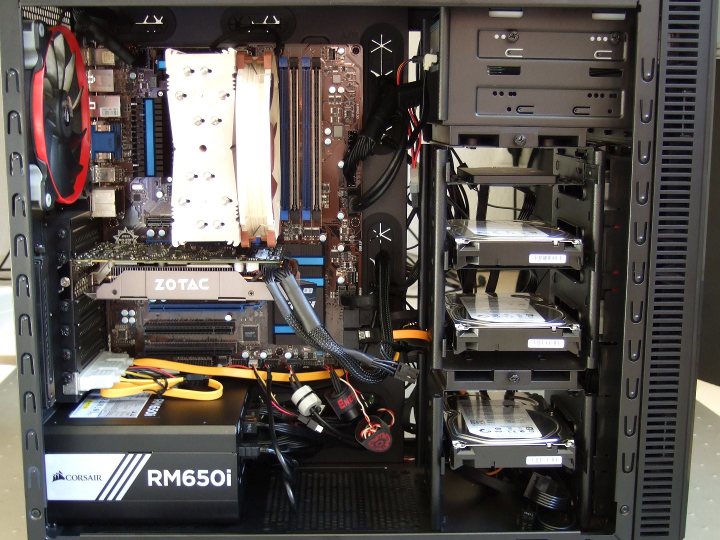 Nicht über die Ferritkerne an den Kabeln rechts vom Netzteil wundern... und das über dem Netzteil ist ein eSATA-Adapter via Slotblech, den brauche ich für eine externe Festplatte.
