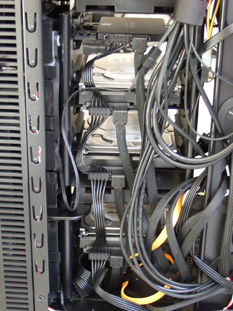 Die SATA- und Molex-Kabelstränge sind in flacher Ausführung. Man sieht direkt links bei den Festplatten, was dies für Vorteile hat. Statt wie beim Enermax mit zwei Kabelsträngen arbeiten zu müssen, weil dessen gesleevte Kabel so starr waren, kann ich nun mit einem einzigen flachen Kabelstrang alle vier Massenspeicher versorgen: