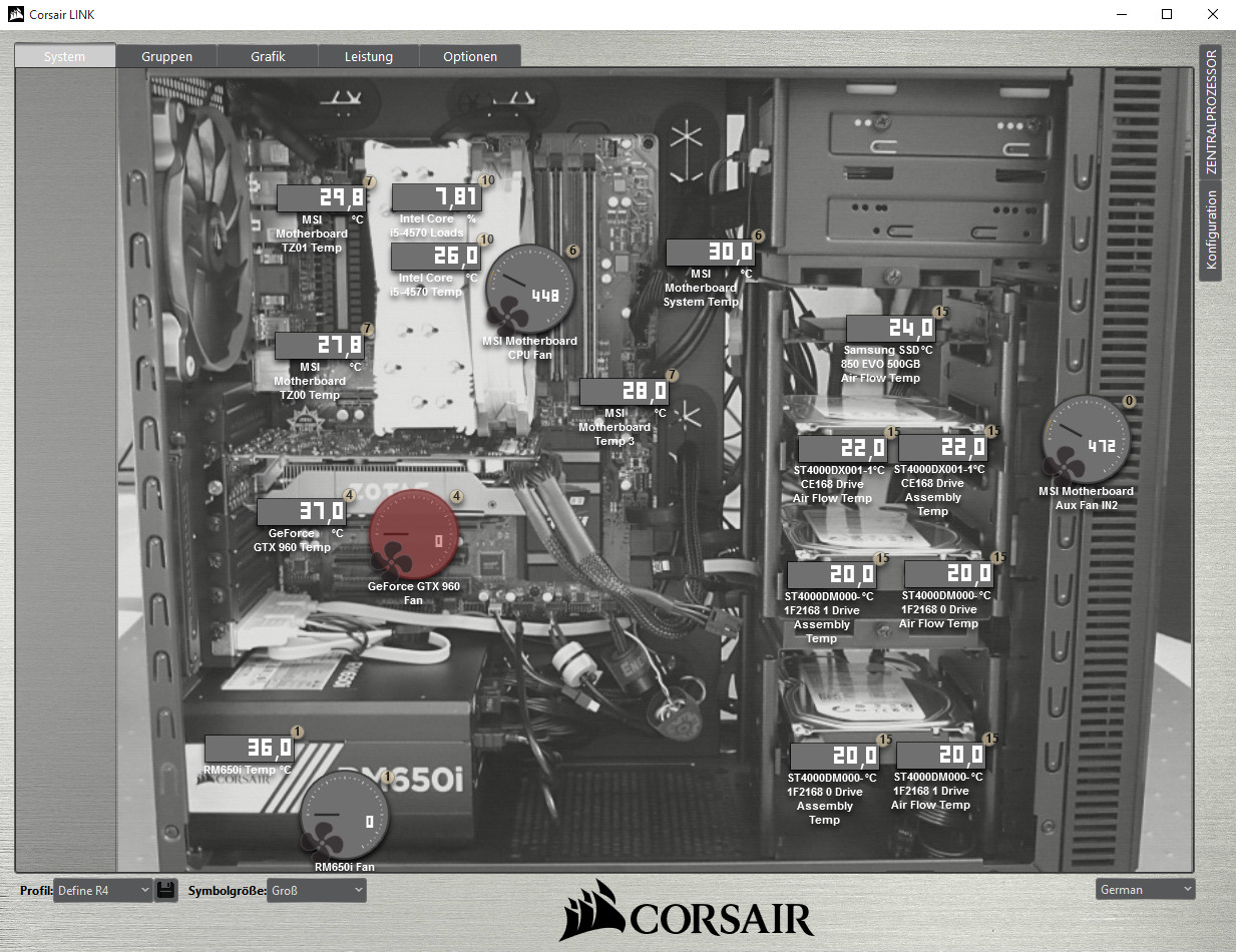 Pluspunkt, die Abfrage der Sensoren hält die Festplatten nicht am Laufen und weckt sie nicht auf, wenn sie per Energiesparplan ausgeschaltet wurden. Minuspunkt, der - bei Leerlauf oder geringer Grafiklast - stillstehende Lüfter der GeForce 960 wird per rot blinkendem Symbol moniert. Da mittlerweile sehr viele Grafikkarten beim Däumchen drehen die Lüfter anhalten, sollte Corsair dies nochmal überarbeiten, da ich auch keine Option gefunden habe, um diesen Alarm zu deaktivieren. Immerhin wird nicht auch noch ein Warnton ausgegeben.