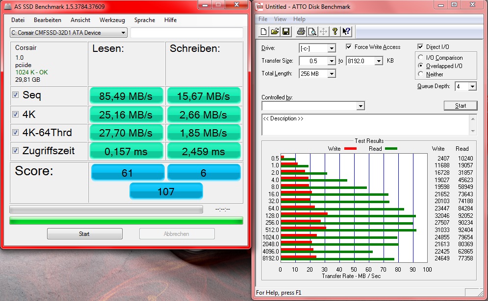 nutze nun seit bald einem Jahr die Corsair X32 SSD. Habe von Anfang an nicht zugewiesene Sektoren oder so und der SATA Controller läuft im IDE Modus. Nun habe ich mal zum Spaß ein paar Benchmarks gestartet und das Ergebnis entspricht nicht ganz dem was ich erwartet hatte: Ich komme sowohl mit ATTO als auch mit AS SSD Benchmark auf ~ 85 MB im Lesen und ~ 15 MB im Schreiben. Bei HD Tune komme ich beim lesen wenigstens noch auf 125 MB im Durchschnitt.