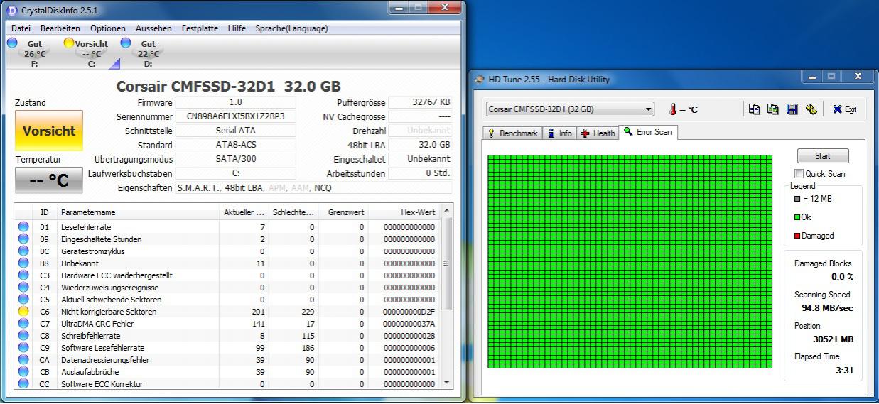 2. Bei Crystal Disc Info ist der Zustand schon "Vorsicht", es heißt es wären zu viele nicht korrigierbare Sektoren vorhanden.