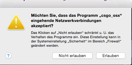 bei Counter-Strike: Global Offensive habe ich seit kurzem das Problem, dass bei jedem Spielstart der Programmstart abbricht und eine Rückfrage der Systemfirewall (siehe Screenshot) kommt. Es ist vollkommen egal ob ich diesen bestätige oder nicht, die Frage kommt beim nächsten Start wieder.