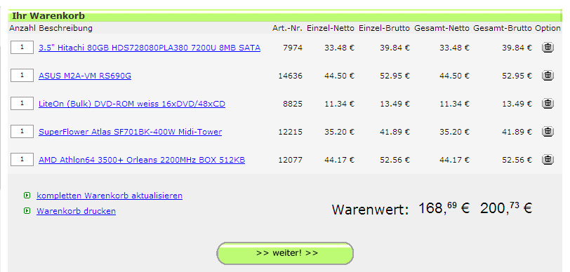 Genau! Dass der Ram fehlt, habe ich ja im Text erwähnt. Außerdem sollte dies deutlich machen, dass 200 Euro eben nicht drin sind bei einem Komplett-PC, trotz billigster Komponenten. Sofern ein DVD-Laufwerk nicht nötig ist, einfach 14 Euro abziehen, 35 Euro für den Ram drauf und noch einmal 12 Euro für den Versand. Wie ihr seht: es langt hinten und vorne nicht ... es sei denn man möchte einen 30-Euro-Sempron verbauen ...