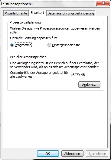 genau, benutzerdefiniert einstellen und dann 2 mal das gleiche. 6144 war nur ein Beispiel. Wenn du 16GB hast, kannst du auch 2 x 2048 oder 3072 eintragen. Es reicht wenig im Prinzip. Ganz abschalten tu ich sie aber nie, weil manche Programme sonst nicht laufen sollen, ausserdem werden manche Daten sonst bei plötzlichen Abstürzen einfach gelöscht.