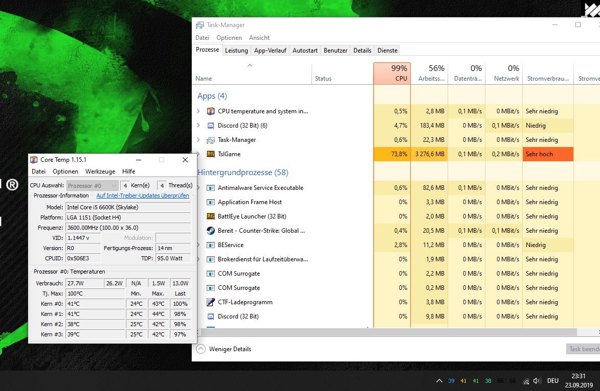 1. Ich habe bei allen Spielen die ich spiele um einiges weniger FPS wie zuvor auf meinem Laptop obwohl mein momentaner PC laut GPU/CPU UserBenchmark überall besser sein sollte. Bei PUBG z.B. ca 30 FPS, bei CSGO ca 80 FPS immer bei niedrigsten Einstellungen. Die CPU-Auslastung während des spielens ist laut Task-Manager immer zwischen 98 und 100%.