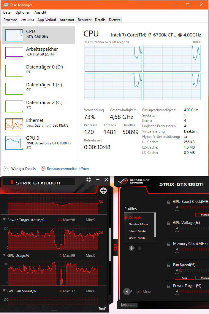 CPU Last @ 4.7Ghz ist immer ausnahmslos 100% auf allen 4 Kernen. GPU-Load beträgt hingegen nur 60-80%, wobei man quasi zu 80% bei 60% GPU-Load rumdümpelt. Das entspricht also einem ordentlich übertakteten i5 6600K oder 7600K.