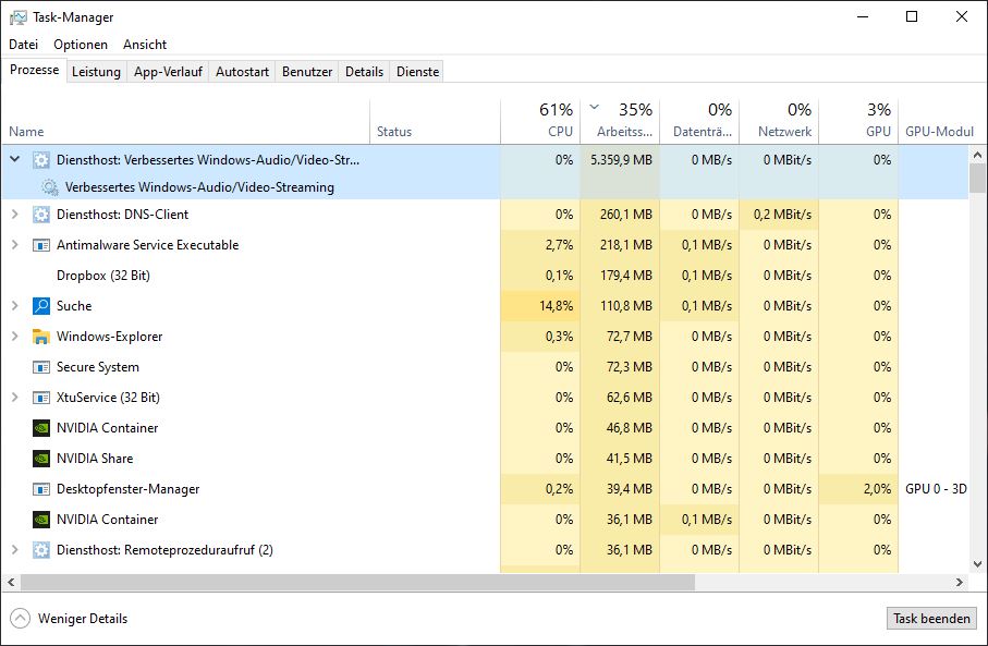 Ich will dies jetzt nur als Möglichkeit anführen, was es noch sein könnte, basierend auf meinen Erfahrungen eben. Leider kann man die Prozesse bei dir im Taskmanager nur Unzureichend begutachten zwecks weiterer Seriöser Fehlereinkreisung.