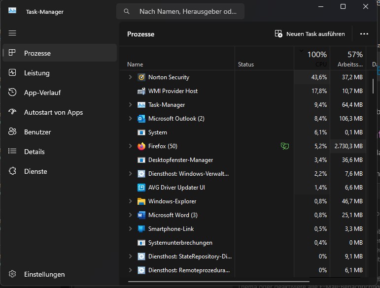 mir ist seit wenigen Tagen aufgefallen, dass meine CPU-Auslastung lt. Task-Manager bei dauerhaft 100% liegt. Mir ist nicht klar was dafür ursächlich sein soll und hoffe hier Hilfe zu finden. Ich habe bereits mittels AVG TuneUp und CCleaner versucht alle Anwendungen und dergleichen, die das System belasten könnten, zu beenden und zu deinstallieren, dennoch zeigt mir der Task-Manager eine so hohe Auslastung und zwar permanent. Auch das Hoch- und Runterfahren des Systems zieht sich seitdem in die Länge. Bislang dauerte der Start des Systems vielleicht 30 Sekunden, seit wenigen Tagen, sind daraus jedoch Minuten geworden. Allein der Aufbau des Desktop dauert wirklich lange, wobei das System schon von einer SSD bootet, also von keiner klassischen HDD mehr. Ich weiß nicht was ich hier noch tun soll.