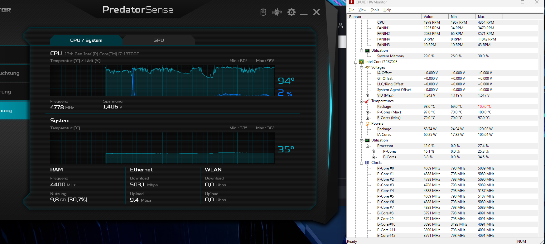 PredatorSense benutzt um die Lüftungssteuerung etwas anzupassen. Genau gesagt gibt es dort 3 Einstellungsmöglichkeiten: 1. Auto (dort habe ich die hohe Temp.) 2. Spielen (die Fans gehen auf über 4000 - 4500 RPM. Temperatur geht zwar runter, aber sollte keine Lösung sein die Fans auf Volllast zu stellen oder? - Gerne eines besseren belehren) 3. Selbsteinstellung
