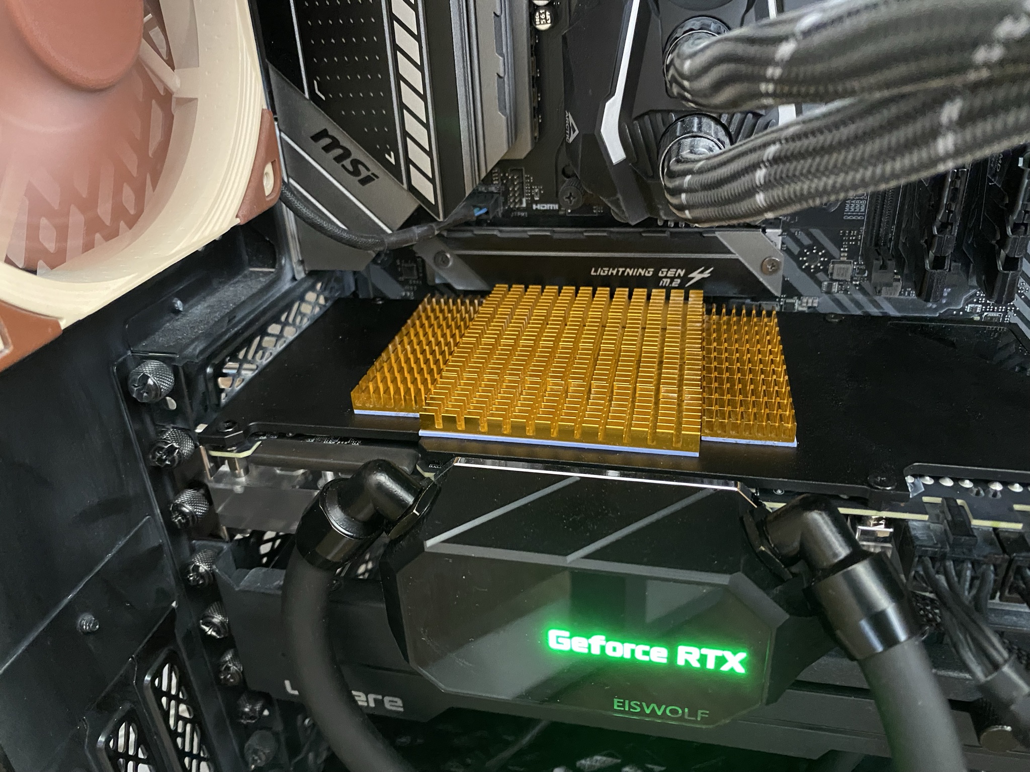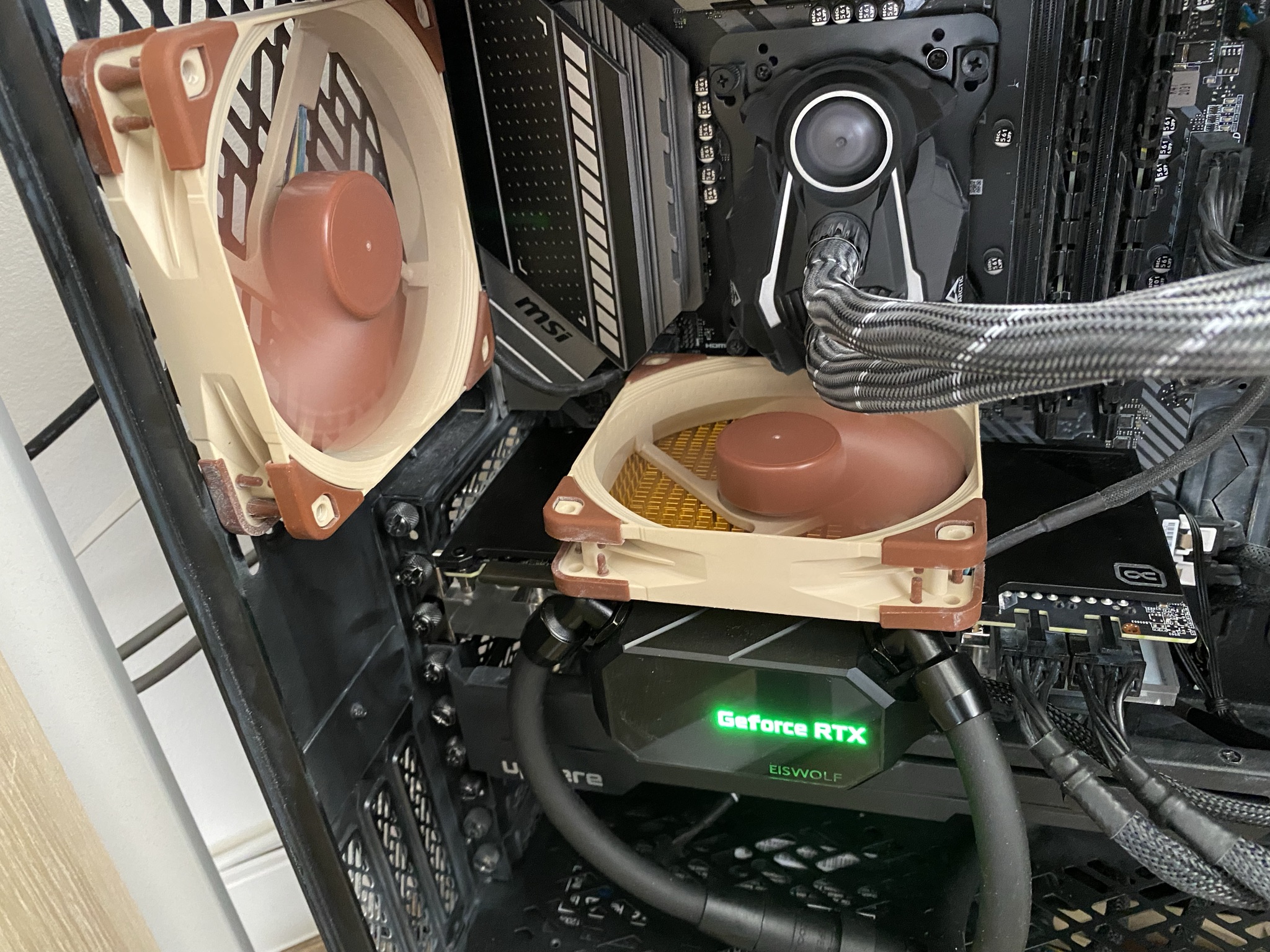 Ich hatte mir die Alphacool Eiswolf 2 AIO - 360mm RTX 3090/3080 mit Backplate (Reference) geholt gehabt und dachte da ist die Backplate ebenfalls aktiv gekühlt. War es leider nicht. So habe ich kleine Kupferpassivkühler mit Thermopads auf der Rückseite, auf die noch ein Noctua Lüfter bläst. Aber es reicht dennoch nicht, den RAM leise zu kühlen. Besonders wenn dann die Temperaturen im Sommer eh noch steigen werden. Ich habe jetzt schon permanent das Fenster offen, um den Raum runter zu kühlen.